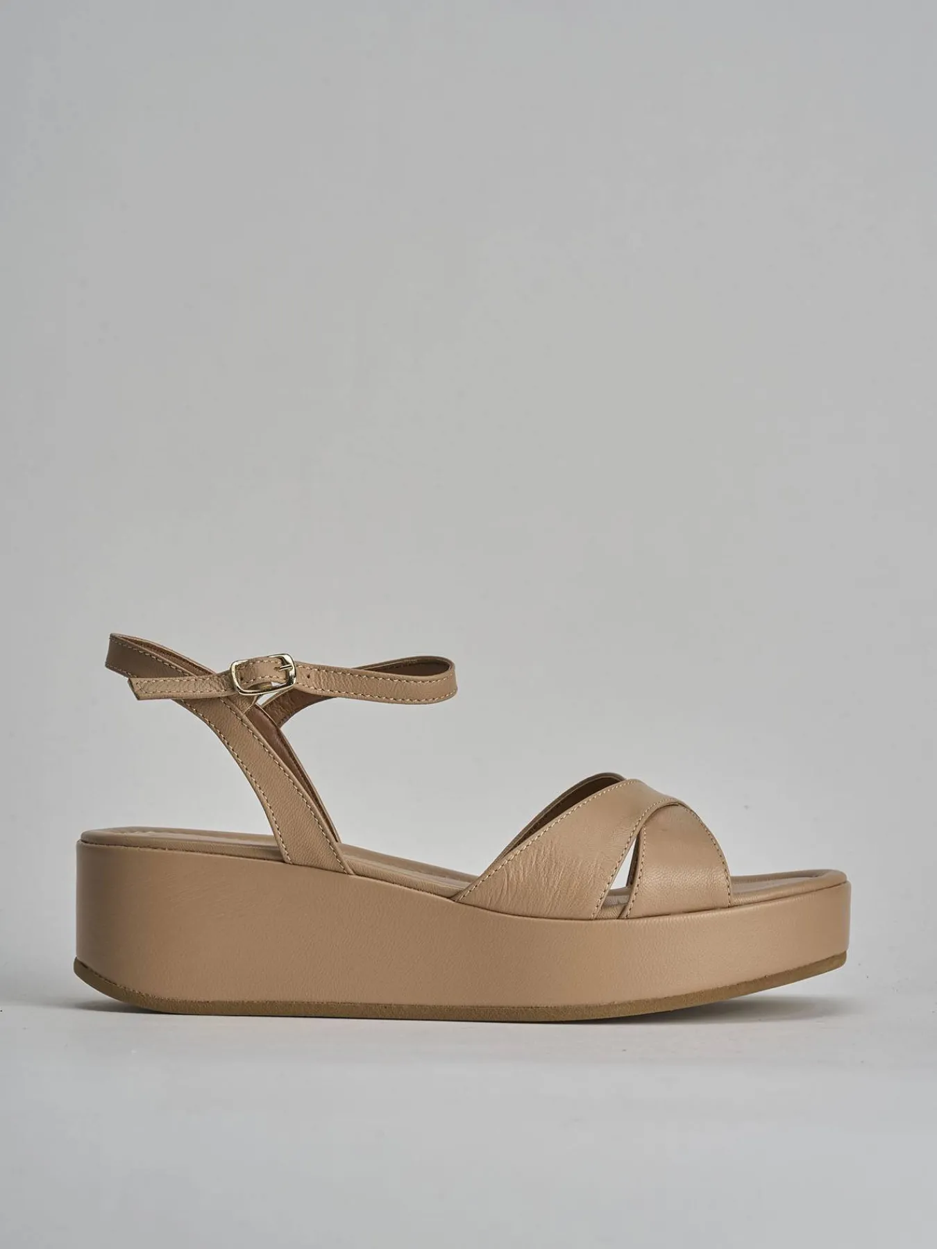 Sandalo zeppa 4 cm fondo in cuoio e soletto interno in vera pelle e leggermente imbottito. Tomaia in morbida pelle, punta leggermente squadrata, fasce incrociate, cinturino con fibbia regolabile e piccolo plateau anteriore di 1.5 cm . Perfetto con un vestito o una gonna midi.