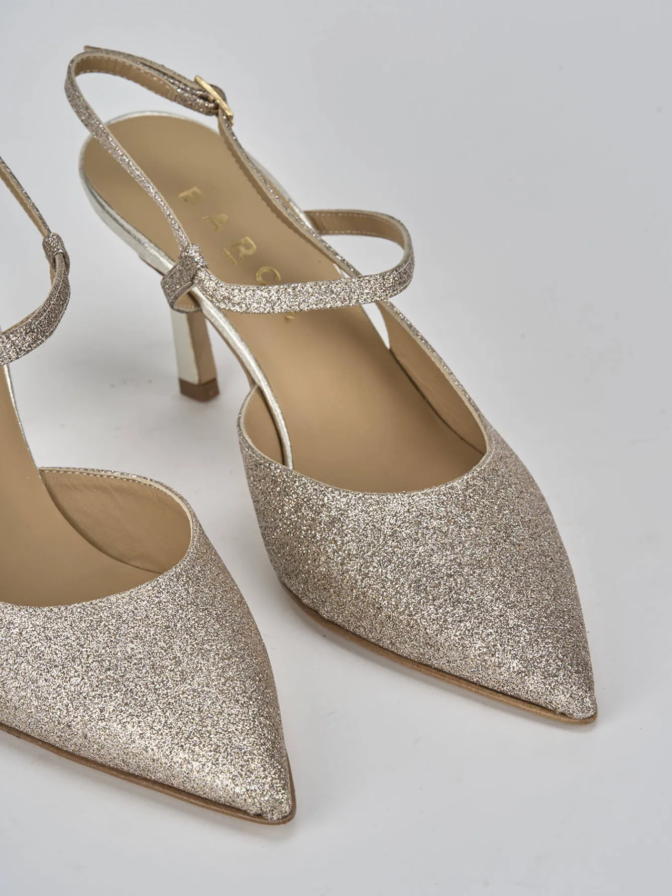 Slingback decolte’ tacco 7 cm fondo in cuoio e soletto interno in vera pelle. Tomaia in morbida pelle foderata di tessuto glitterato, punta sfilata, scollo a ‘U’, cinturino incrociato con fibbia regolabile e tacco fino. Perfetto per le tue serate più importanti.