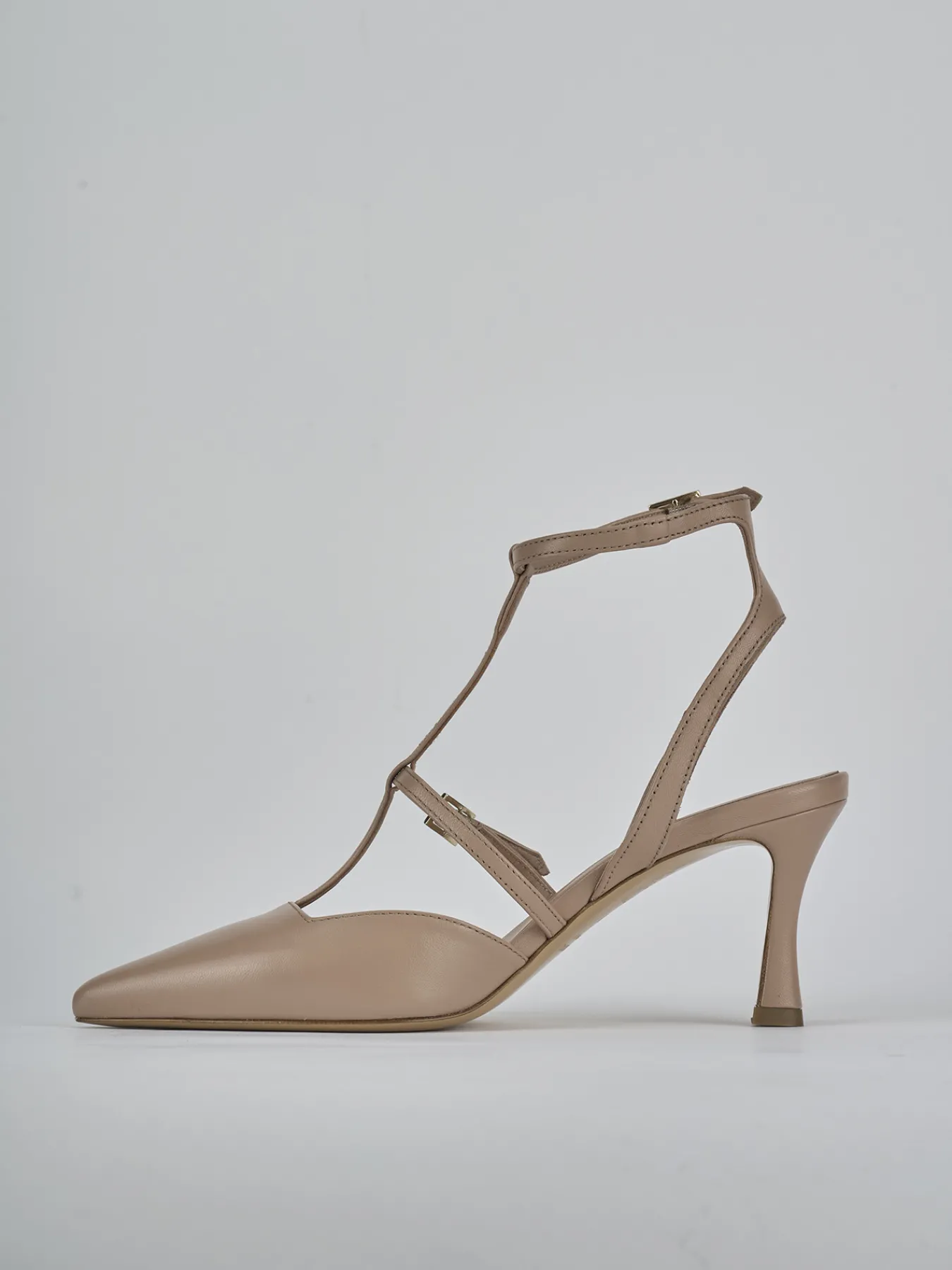 Slingback decolte’ tacco 8 cm fondo in cuoio e soletto interno in vera pelle. Tomaia in morbida pelle, punta sfilata, scollo squadrato, cinturino a ‘T’ che termina con fibbia regolabile altezza caviglia e tacco rocchetto. Perfetto con un vestito o una gonna midi.