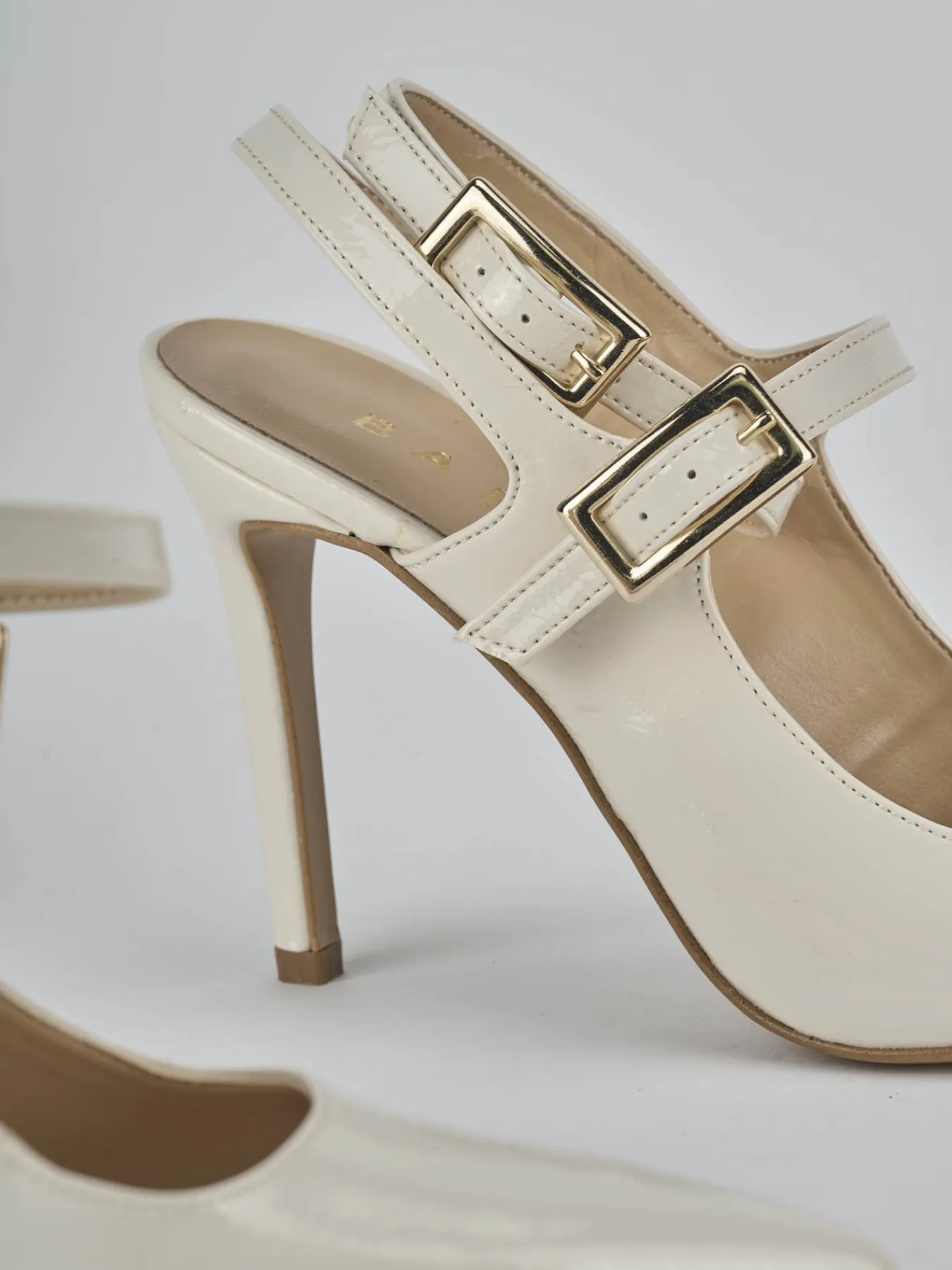 Slingback decolte’ tacco 9 cm fondo in leggerissima gomma e soletto interno in vera pelle. Tomaia in morbida pelle effetto verniciato, punta sfilata, scollo squadrato, cinturino sul collo del piede e in caviglia incrociato con fibbie regolabili e tacco fino per un look chic.