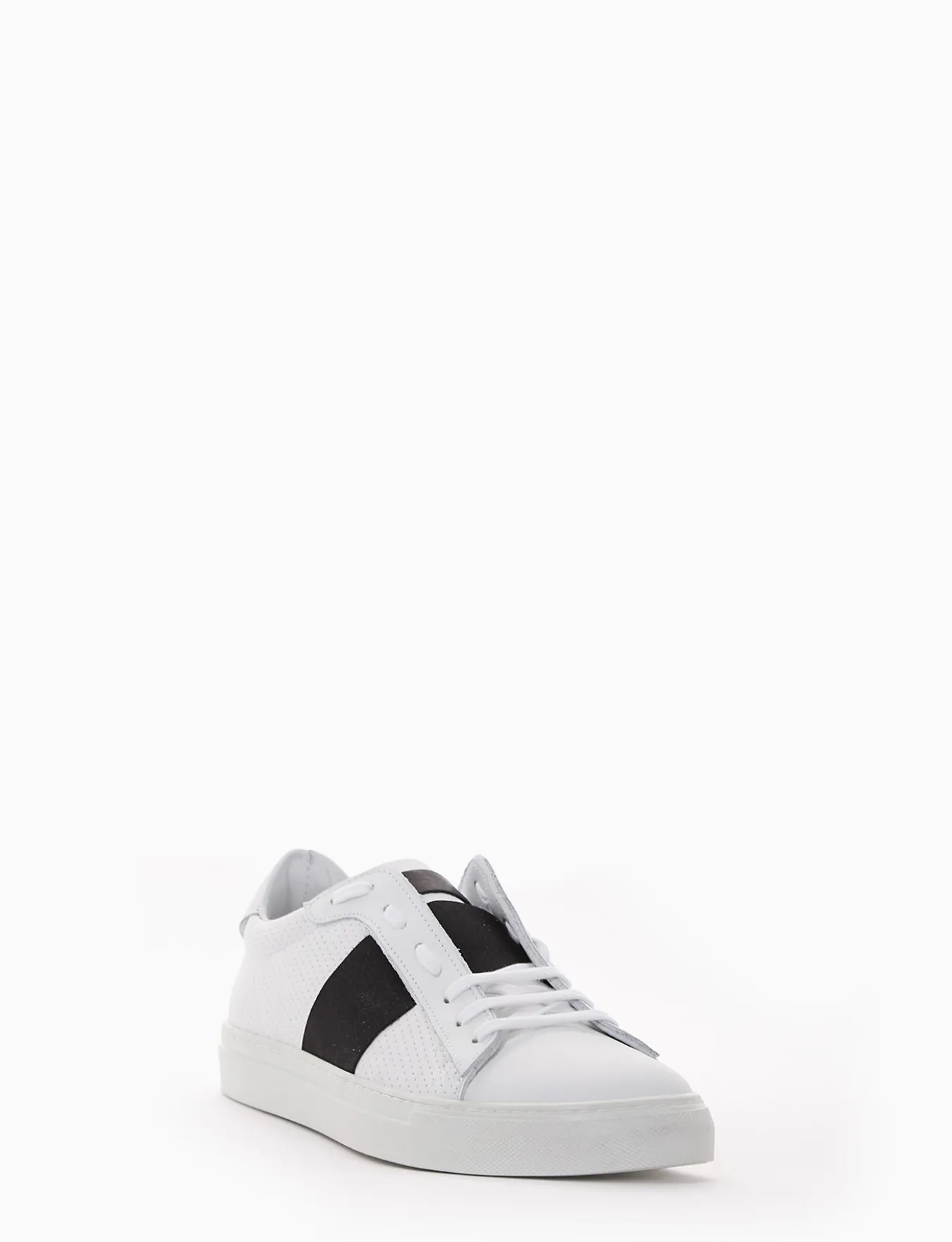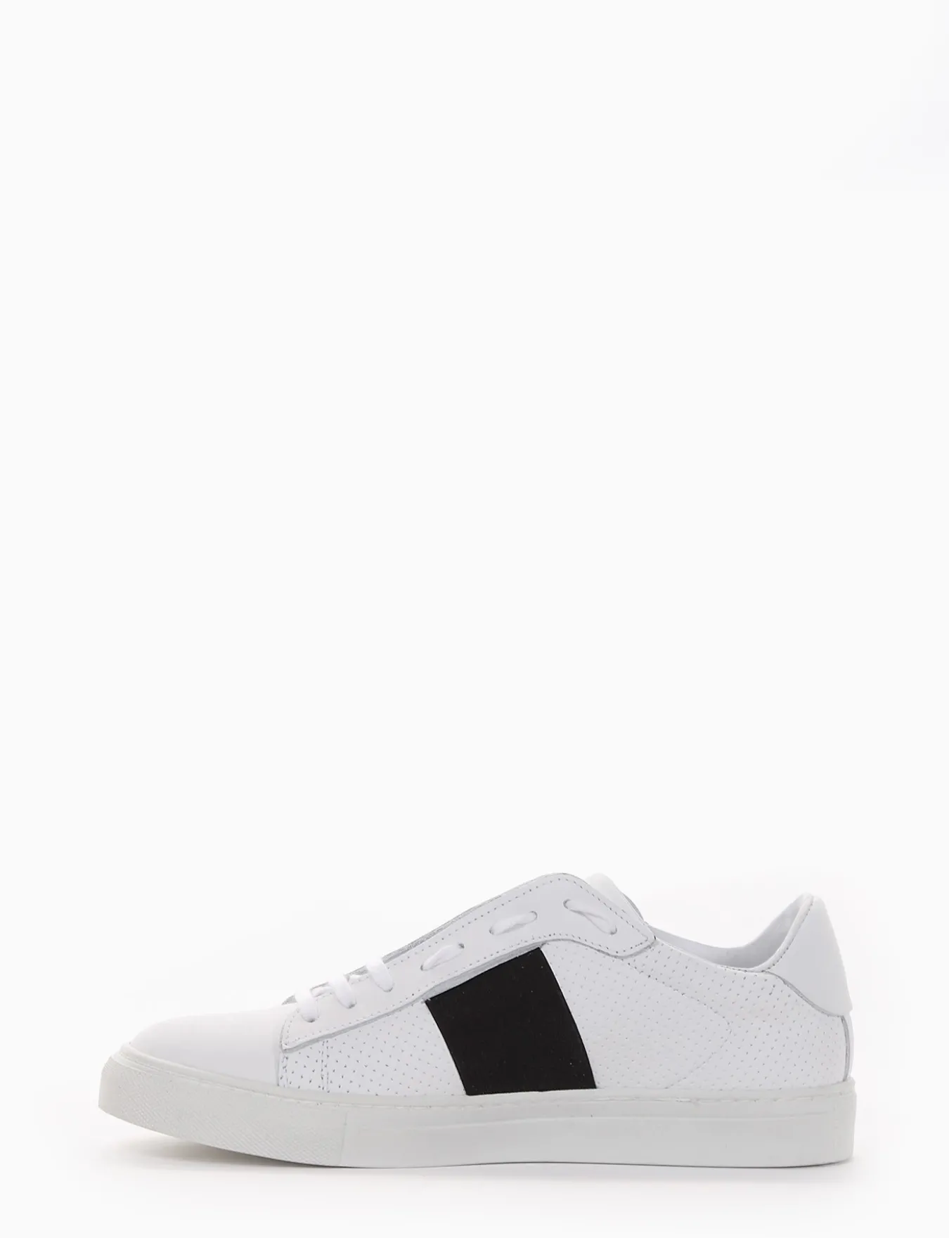 sneakers fondo in gomma e soletto interno in vera pelle. Tomaia in morbidissima pelle nappata, puntale liscio e microforatura laterale con applicazione di una fascia elastica color nero, ideale per il tuo tempo libero.