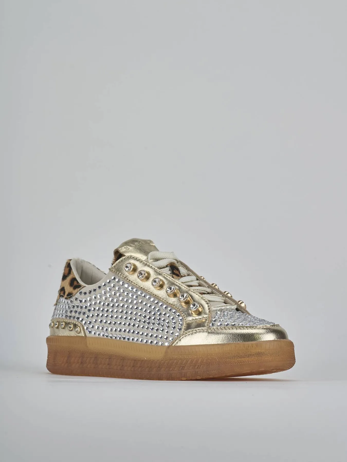 La tomaia è realizzata in morbida pelle laminata, arricchita da dettagli come borchie scintillanti e riporti a contrasto, che donano un tocco chic e moderno.