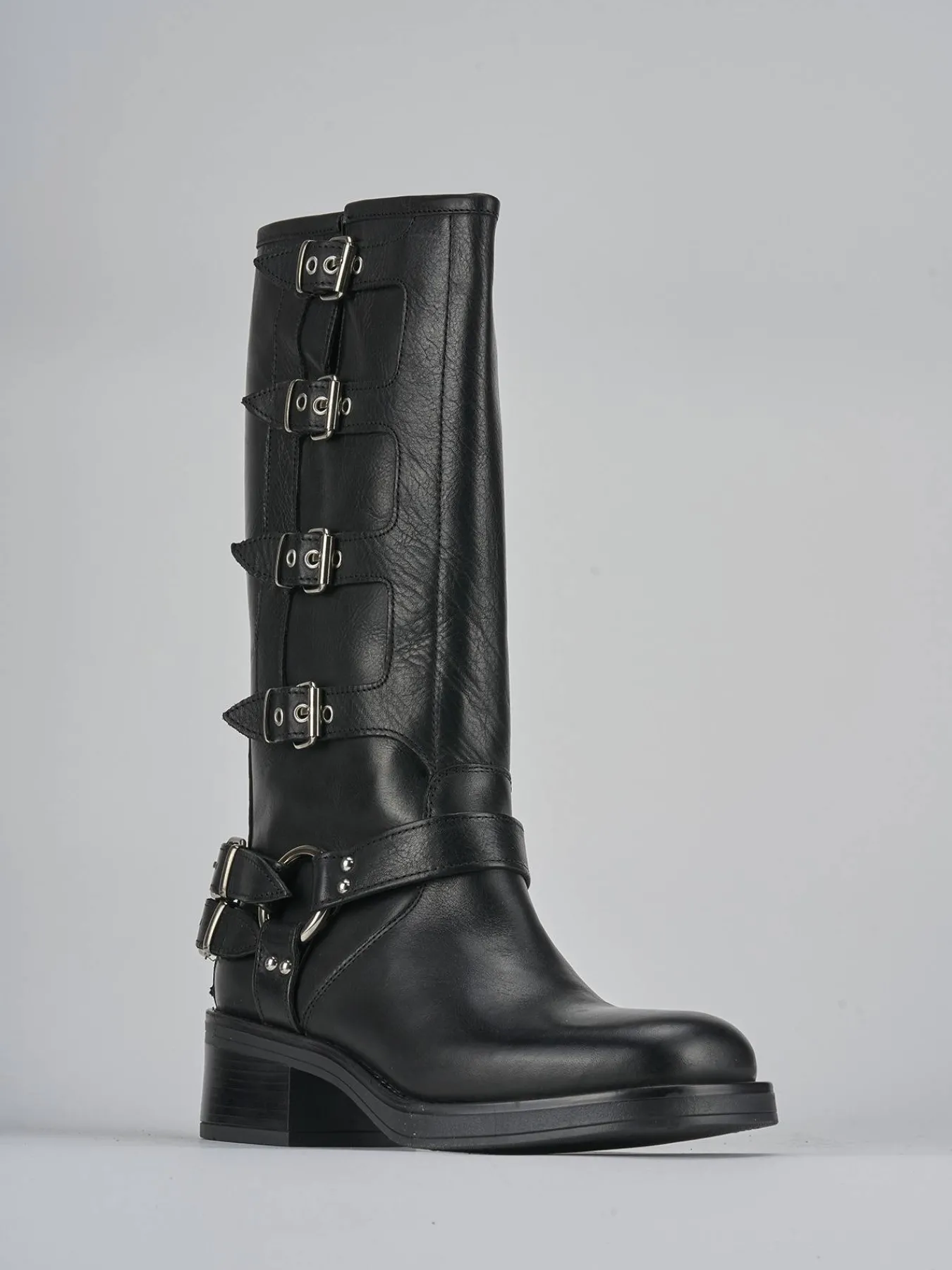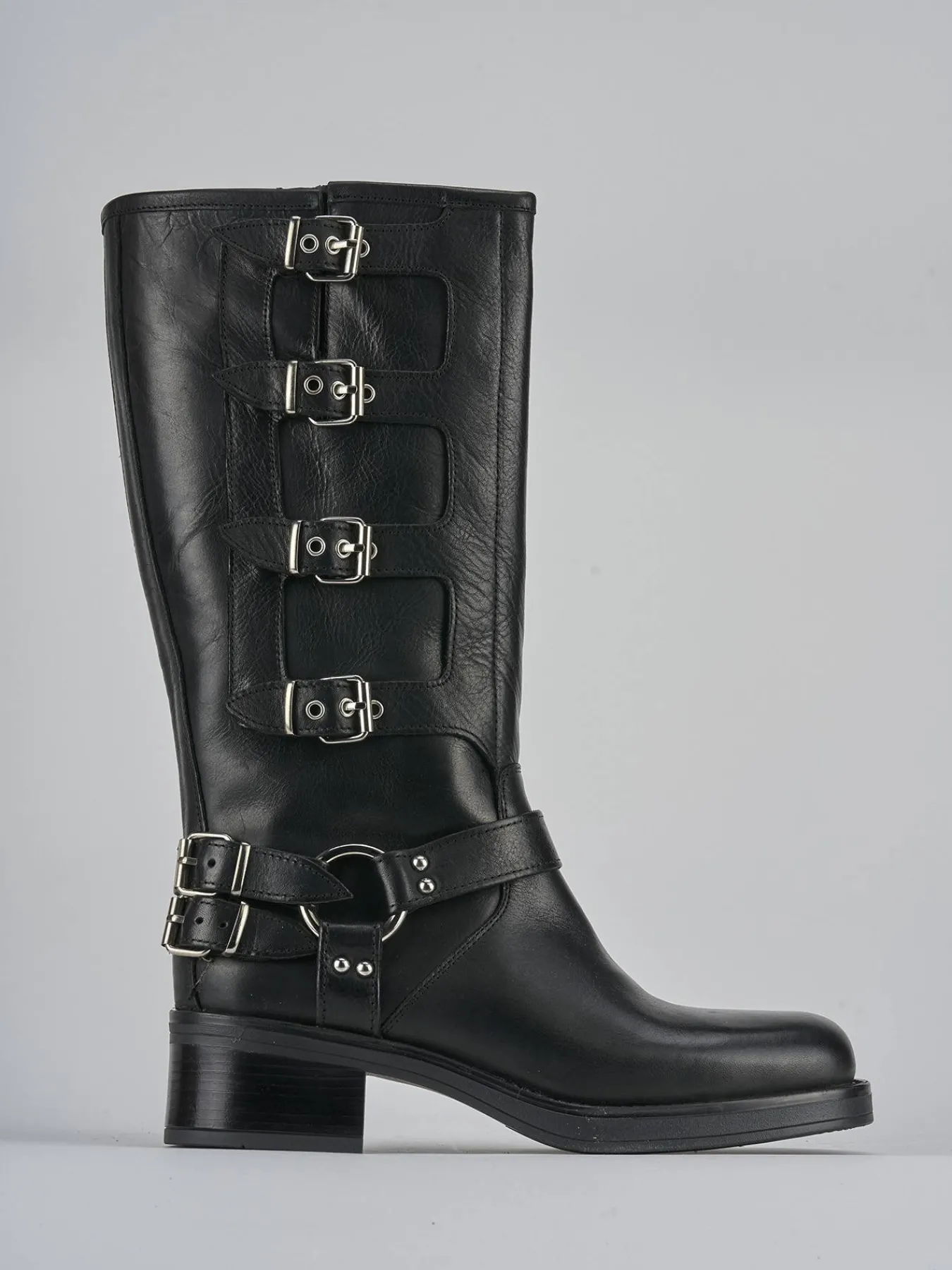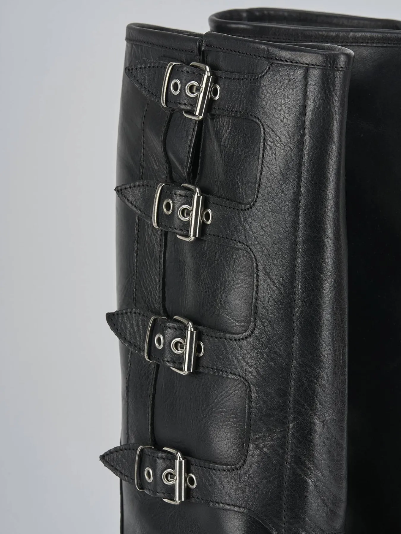 Le doppie fibbie all’altezza della caviglia e le fibbie aggiuntive lungo il gambale, che arriva appena sotto il ginocchio, offrono un look grintoso e alla moda.