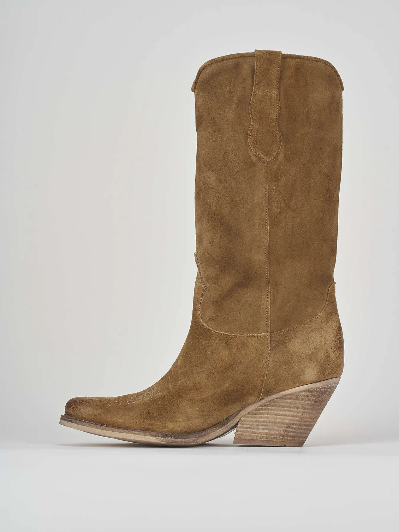 Stivale texano tacco 6 cm, fondo in cuoio e soletto interno in vera pelle. Tomaia in morbida pelle scamosciata leggermente spazzolata anticata, punta sfilata con ricamo tex a contrasto, gambale a tre quarti polpaccio, adatto con un vestito per un look tex-cool.