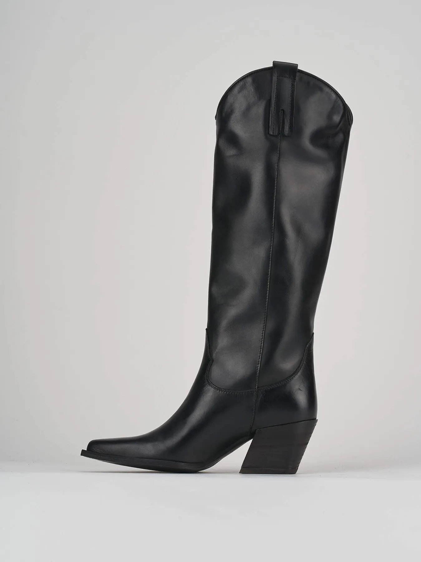 Stivale texano tacco 7 cm, fondo in leggerissima gomma e soletto interno in vera pelle.Tomaia in morbida pelle, punta sfilata, cuciture sulla parte bassa, giusto con una gonna o un vestito per un look tex-cool. Altezza gambale fino a sotto il ginocchio svasato davanti per slanciare la tua figura.