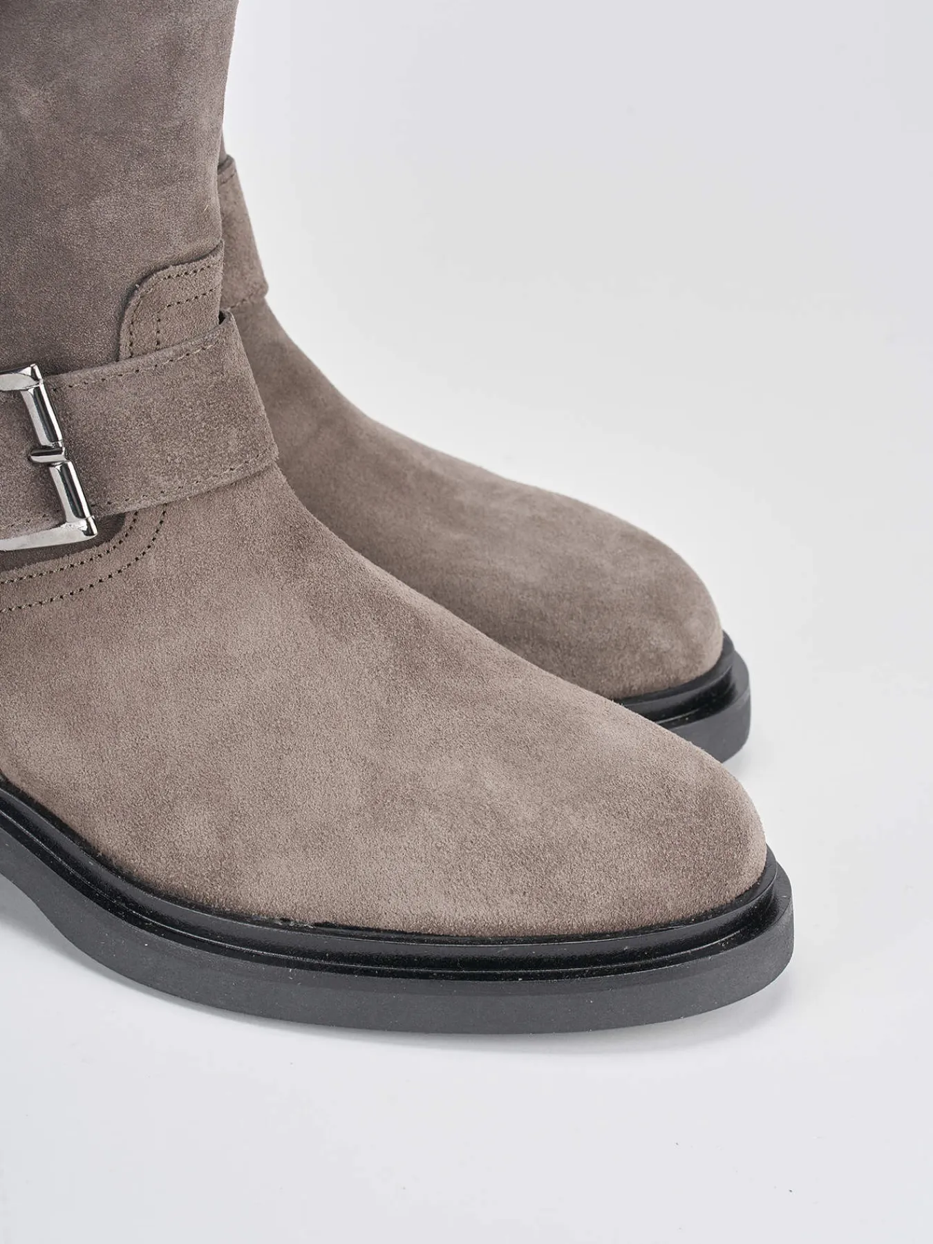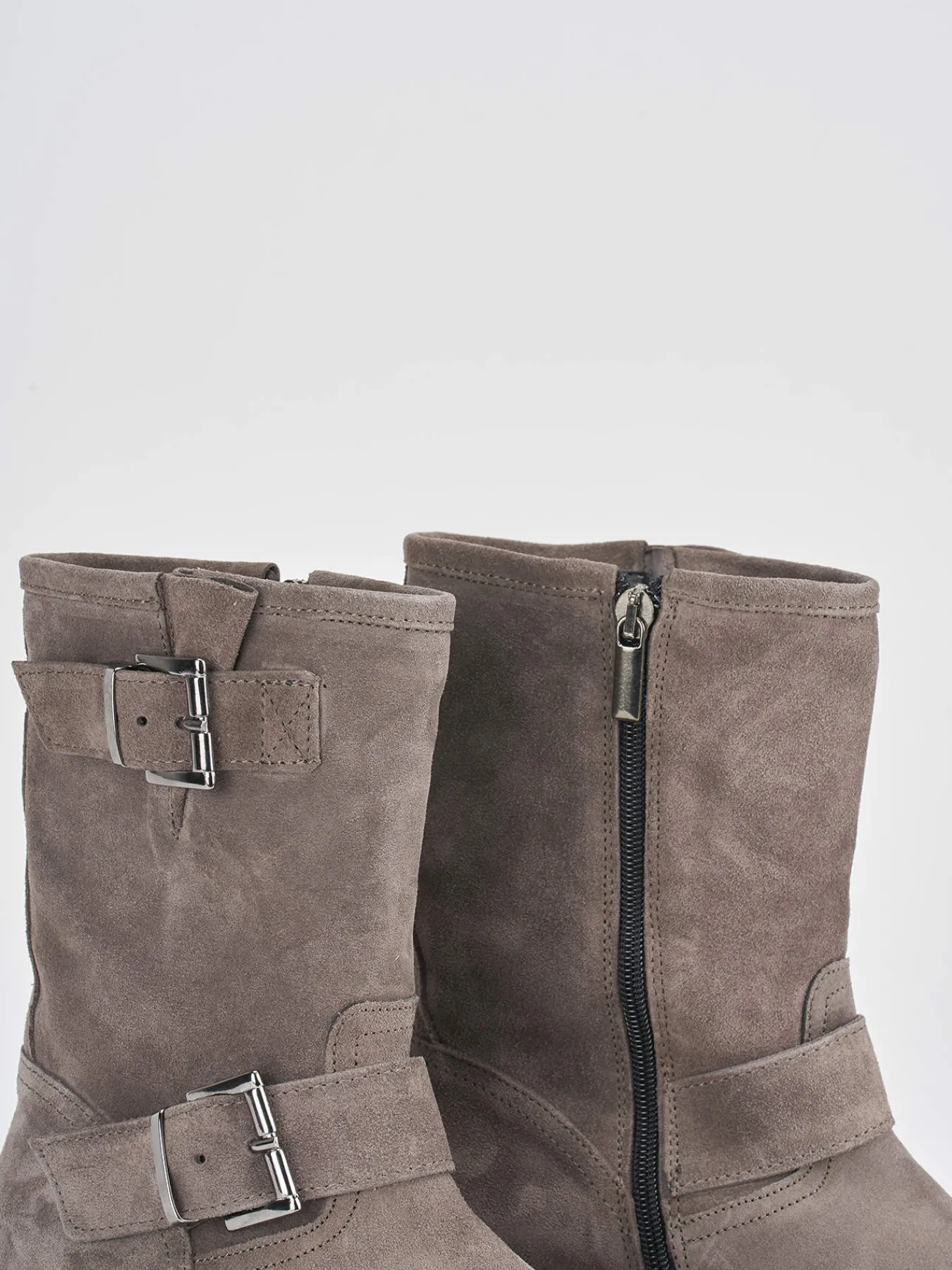Tronchetto tacco 2 cm fondo in gomma e soletto interno in vera pelle. Tomaia in morbido camoscio, punta tonda, cerniera laterale e doppia fibbia per uno stivaletto perfettamente adatto ai tuoi outfit preferiti.