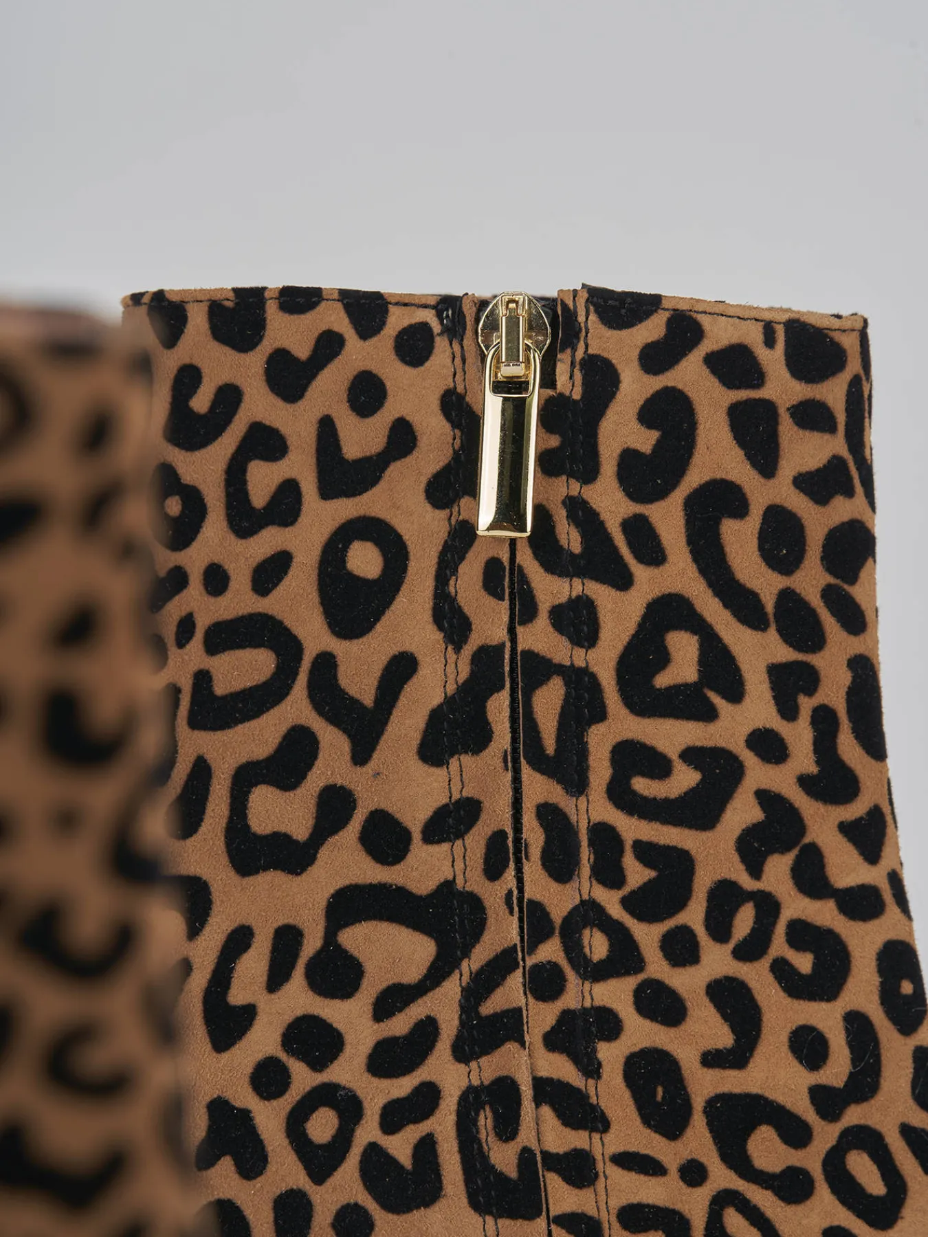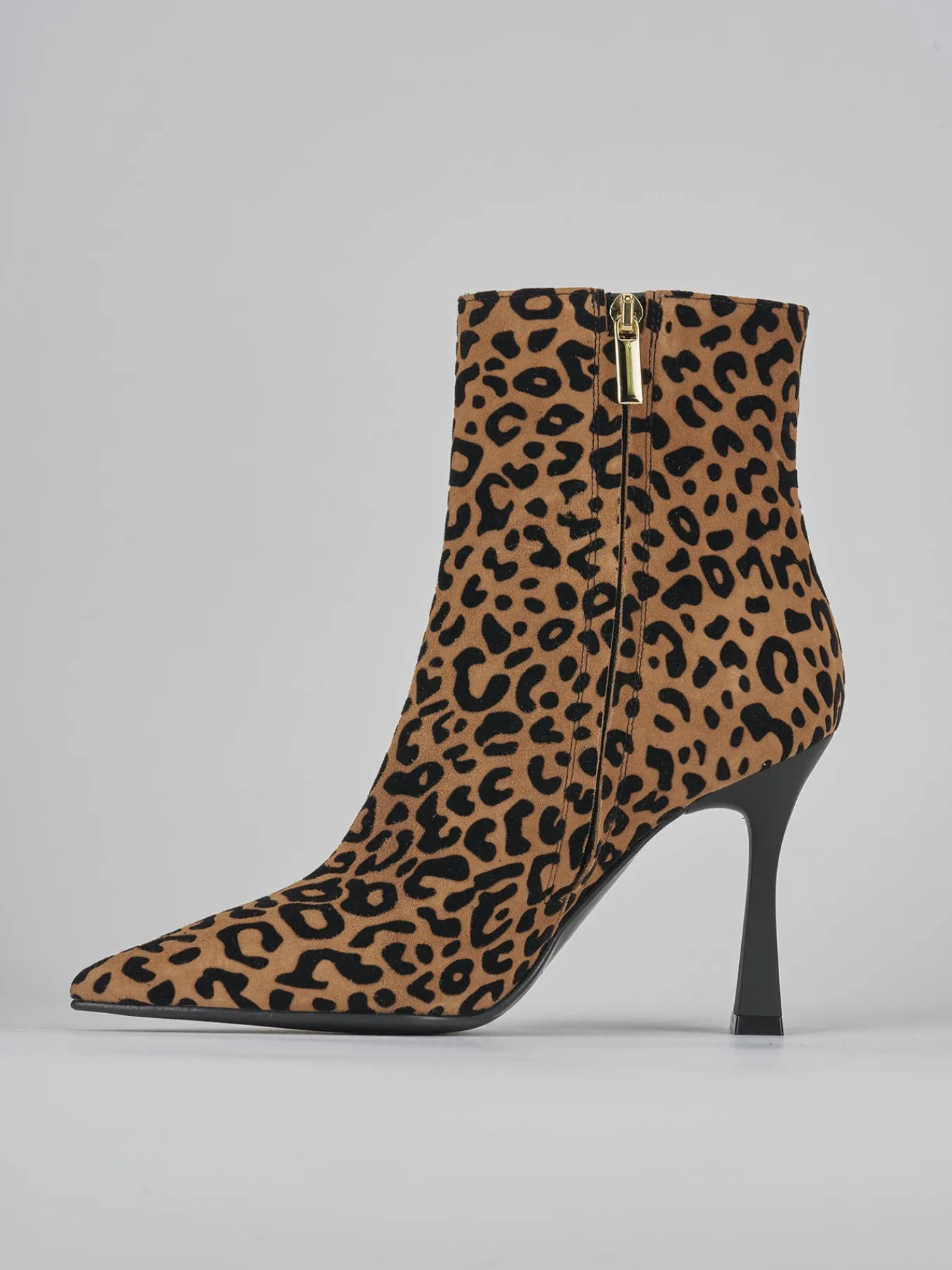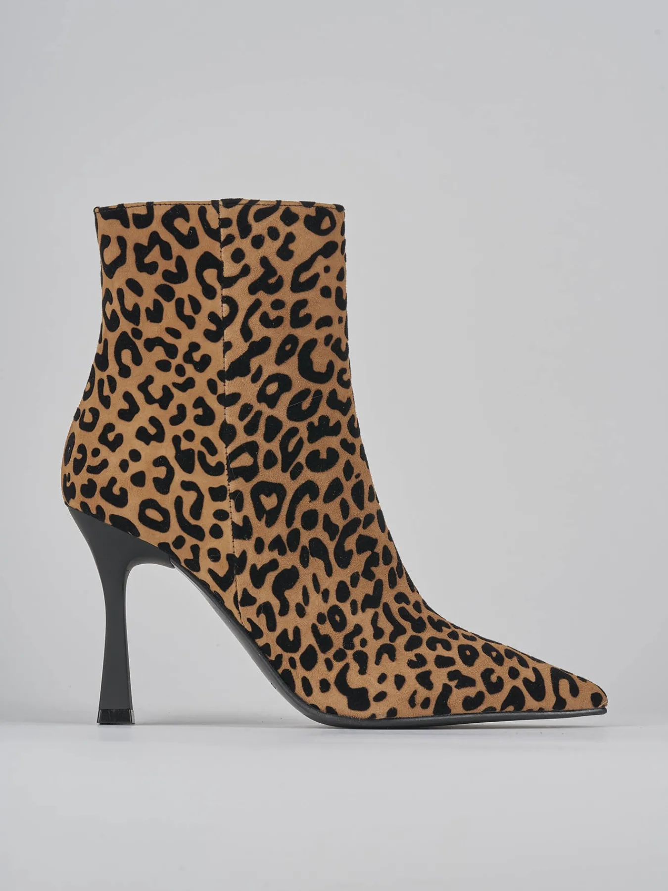 stivaletto tacco 9 cm fondo in leggera gomma e soletto interno in vera pelle. tomaia in morbido camoscio in stampa leopardata, punta sfilata, comoda cerniera laterale. Dettaglio col tacco rocchetto in materiale ABS per un tocco glamour ai tuoi outfit.