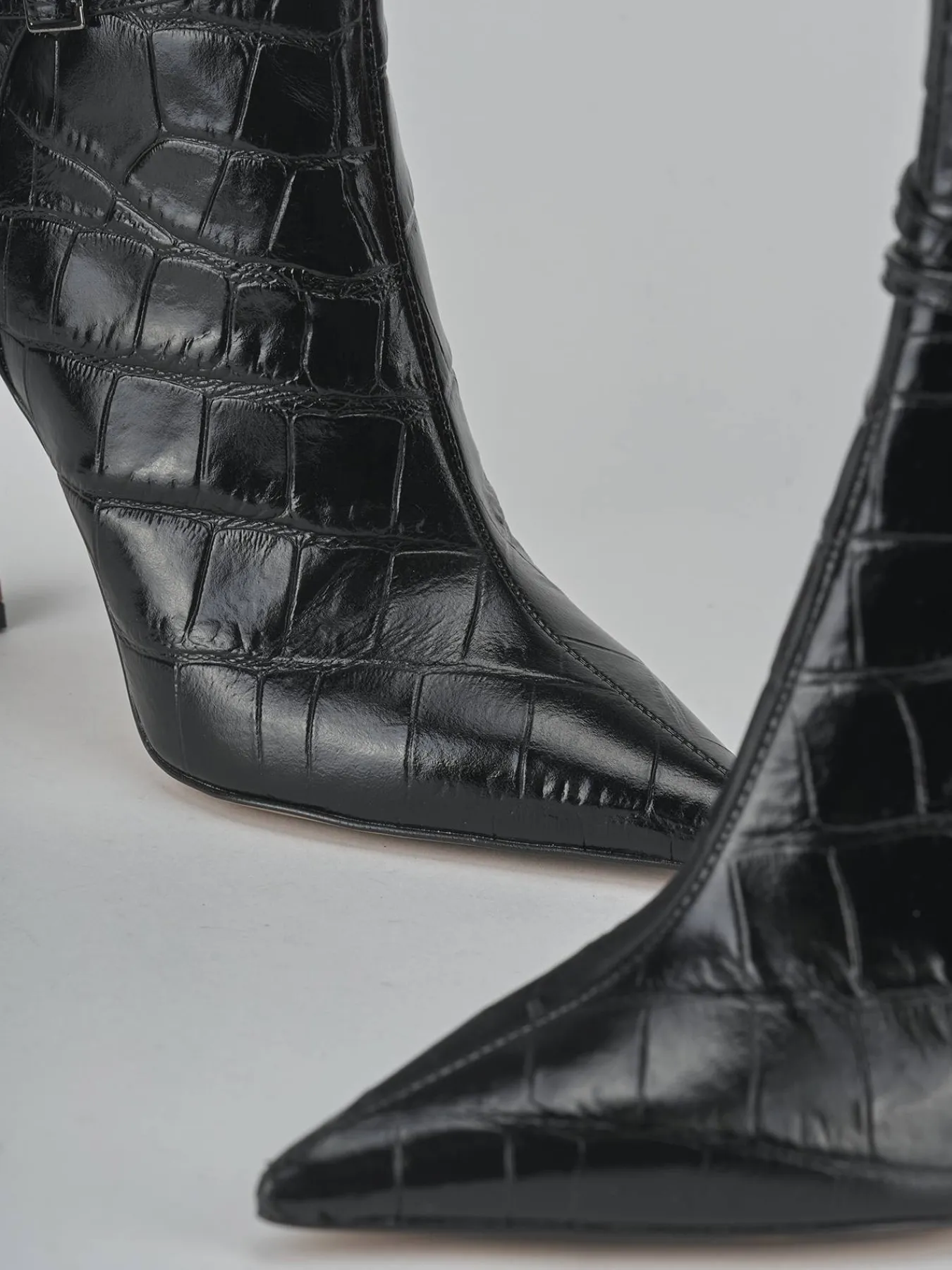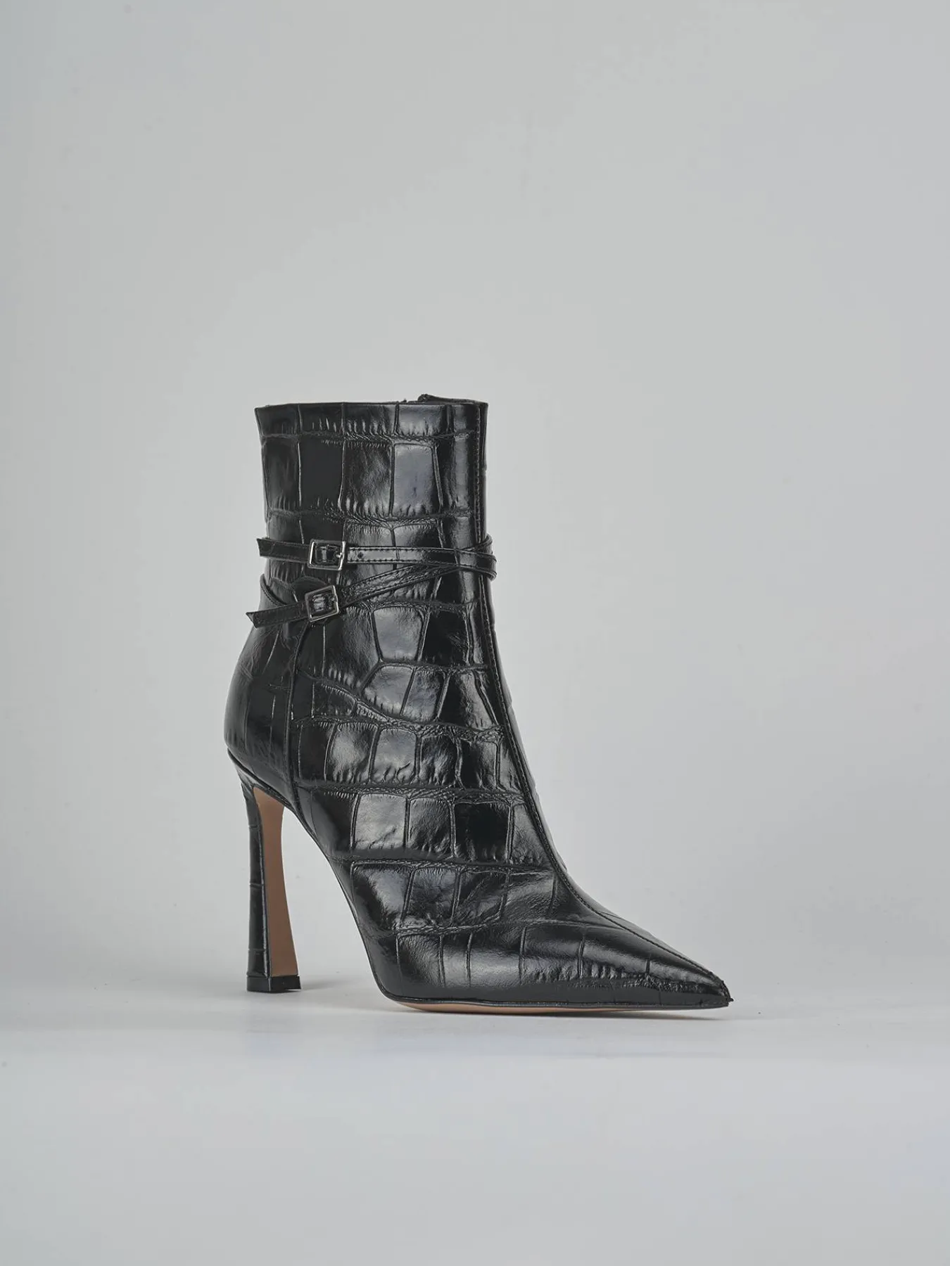 Due cinturini con fibbia regolabile incrociati sul gambale, che si ferma appena sopra la caviglia, offrono un look moderno e versatile.