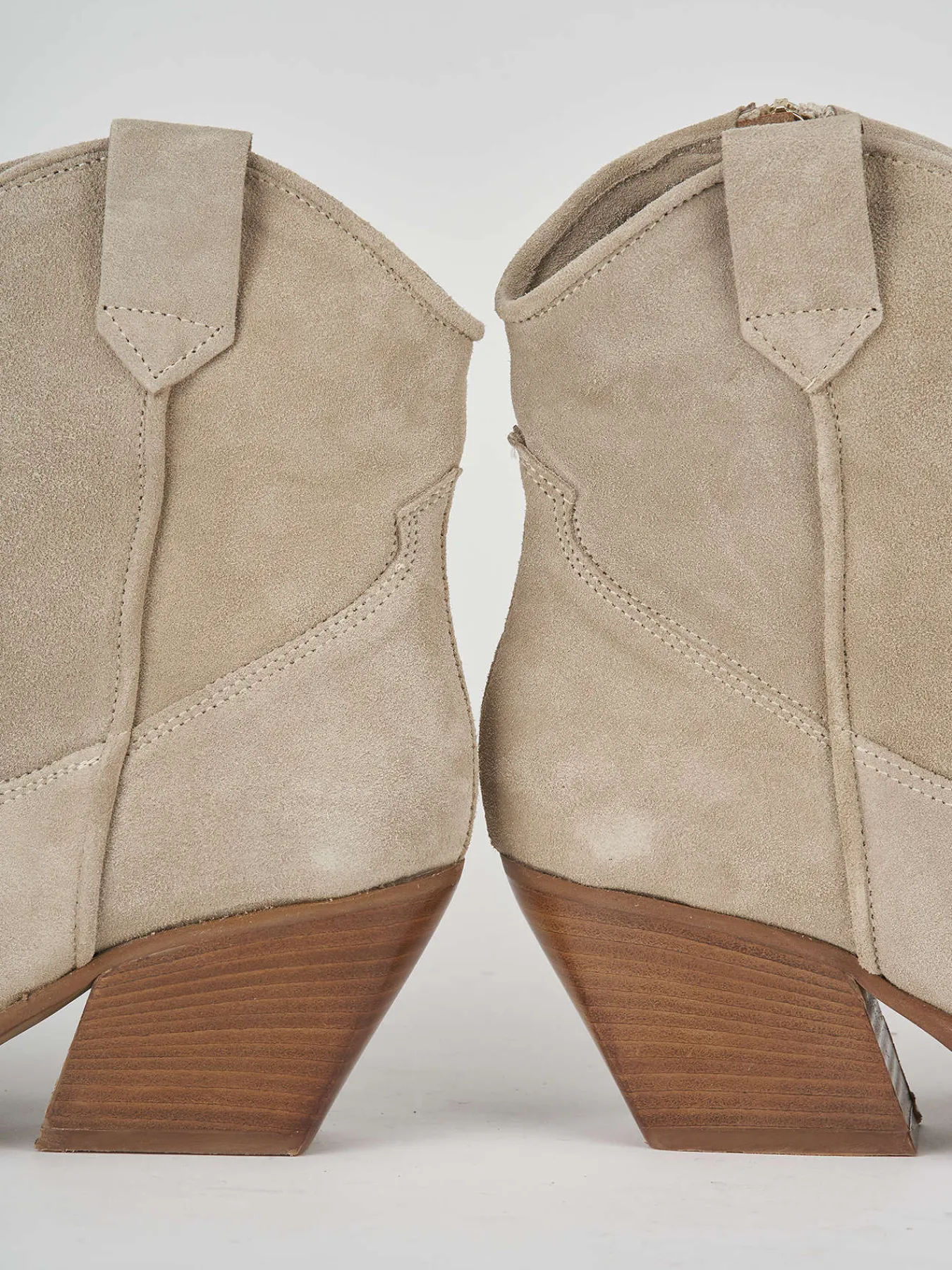 Stivaletto texano tacco 7cm, fondo cuoio e soletto interno in vera pelle. Tomaia in morbido camoscio, punta arrotondata, cuciture esterne visibili, tacco grosso per una camminata comoda, adatte con dei jeans per un look tex- cool.