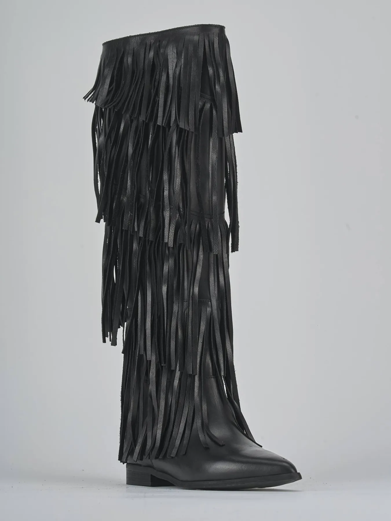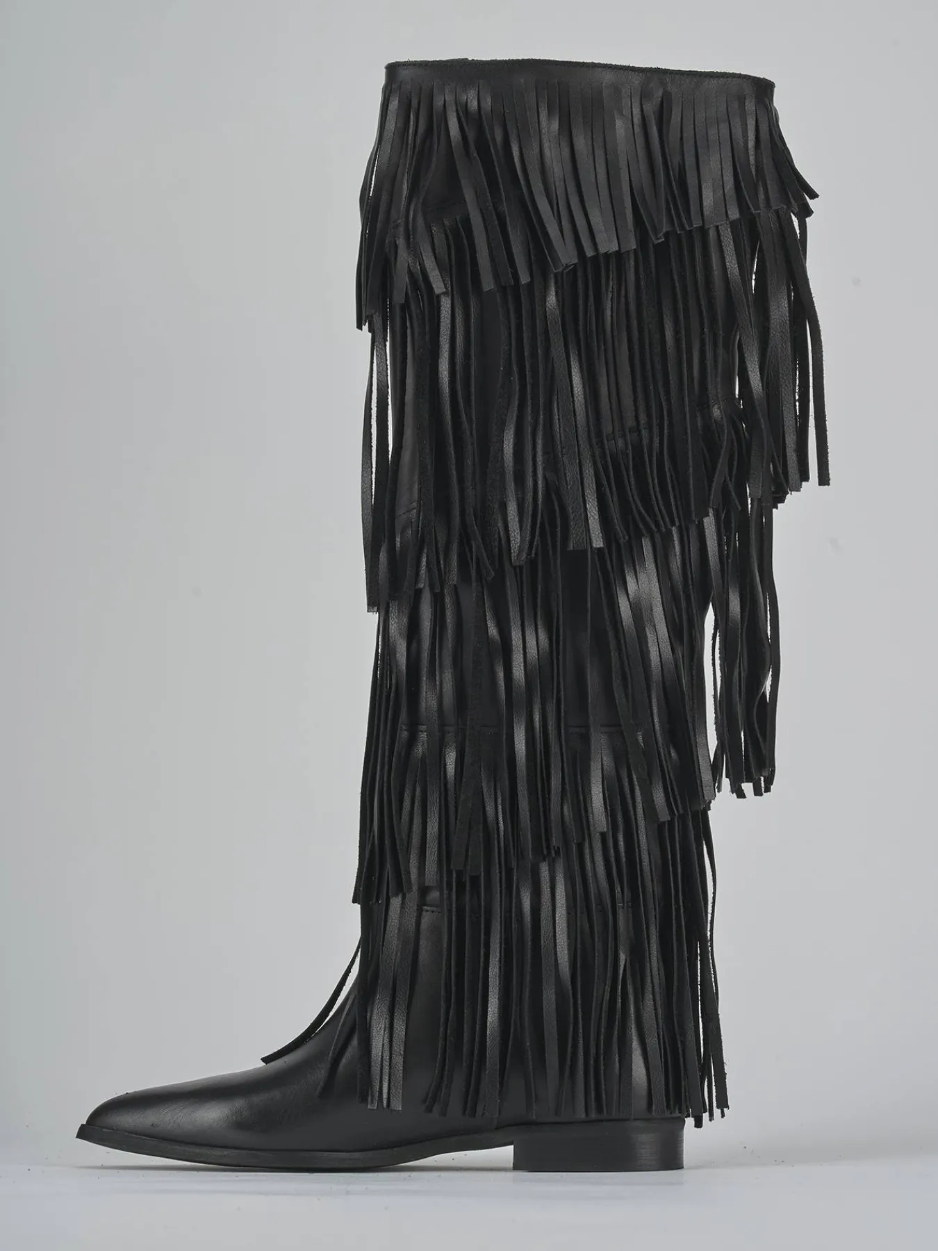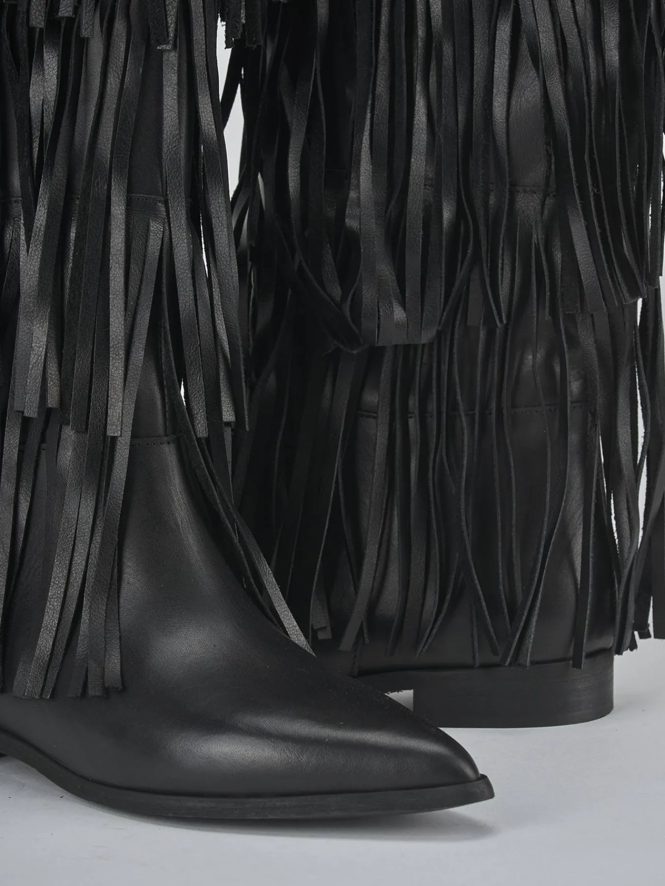 Stivale tacco 2 cm fondo in gomma e soletto interno in vera pelle. Tomaia in morbida pelle, punta sfilata, frange su entrambi i lati del gambale che misura appena sotto il ginocchio. Perfetto con una minigonna e una maglia.