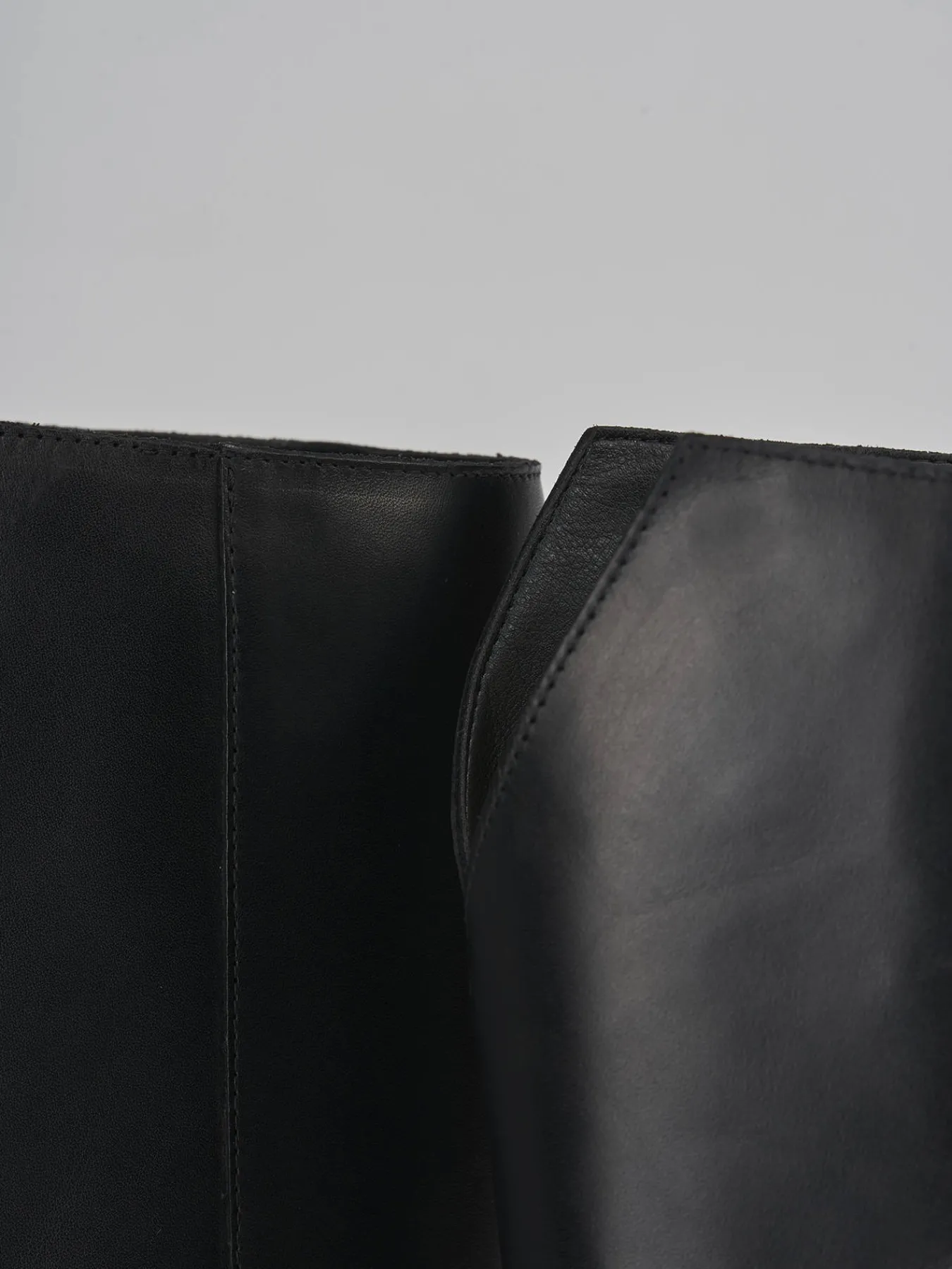 stivale tacco 2 cm fondo in gomma e soletto interno in vera pelle. tomaia in morbida pelle, punta affusolata, cuciture a mano a vista, altezza gambale appena sotto il ginocchio con zeppa interna di 3 cm. dettaglio posteriore con apertura a ‘V’. con una t-shirt elegante e un paio di jeans per un look casual-chic.