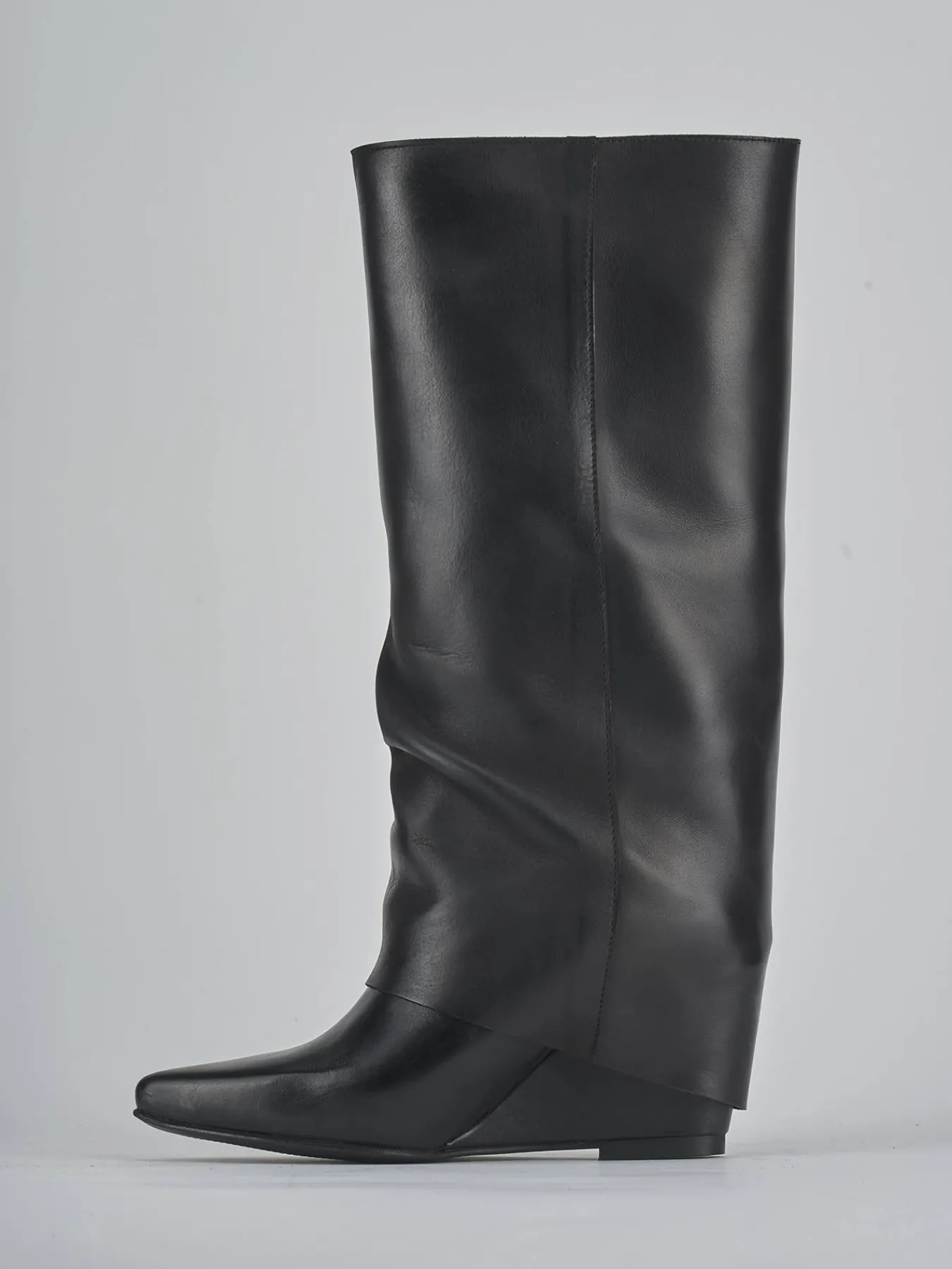 Stivale zeppa 4 cm fondo in gomma e soletto interno in vera pelle. Tomaia in morbida pelle, punta sfilata, cuciture a mano, risvolto aderente sul gambale che misura a 3/4 del polpaccio e gambale ampio. Perfetto per le occasioni più speciali.