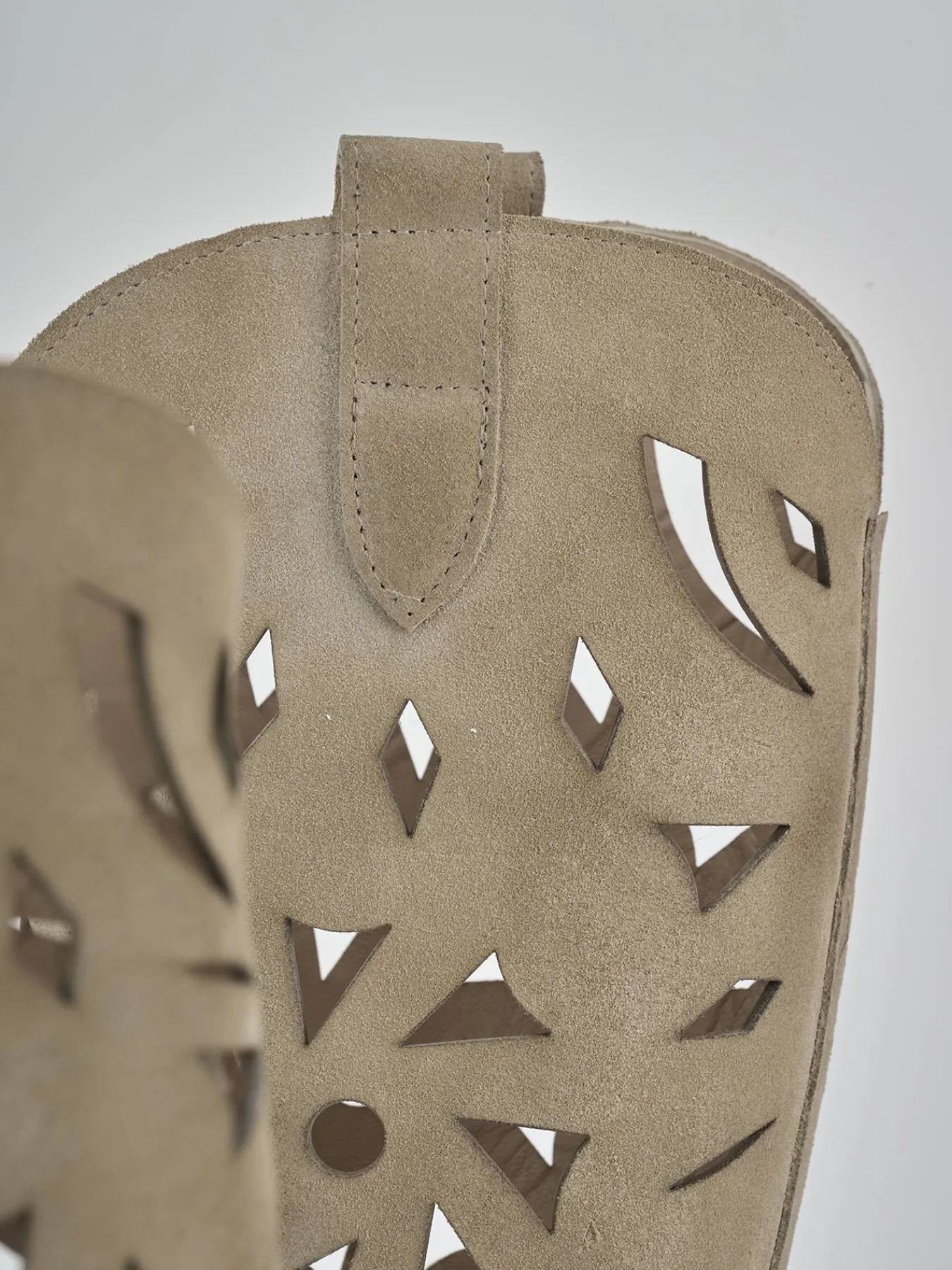 Stivale texano tacco 6 cm fondo in gomma e soletto interno in vera pelle. Tomaia in morbida pelle scamosciata, punta sfilata, gambale laserato che misura appena sotto il ginocchio, ghette e tacco cubano. Guardolo appena sporgente. Perfetto per un look che ti farà notare.