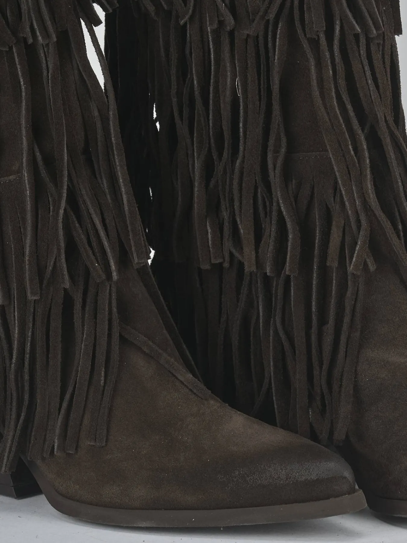 Realizzati in morbido camoscio, questi stivali presentano una punta sfilata e frange accattivanti che catturano l’attenzione a ogni passo.