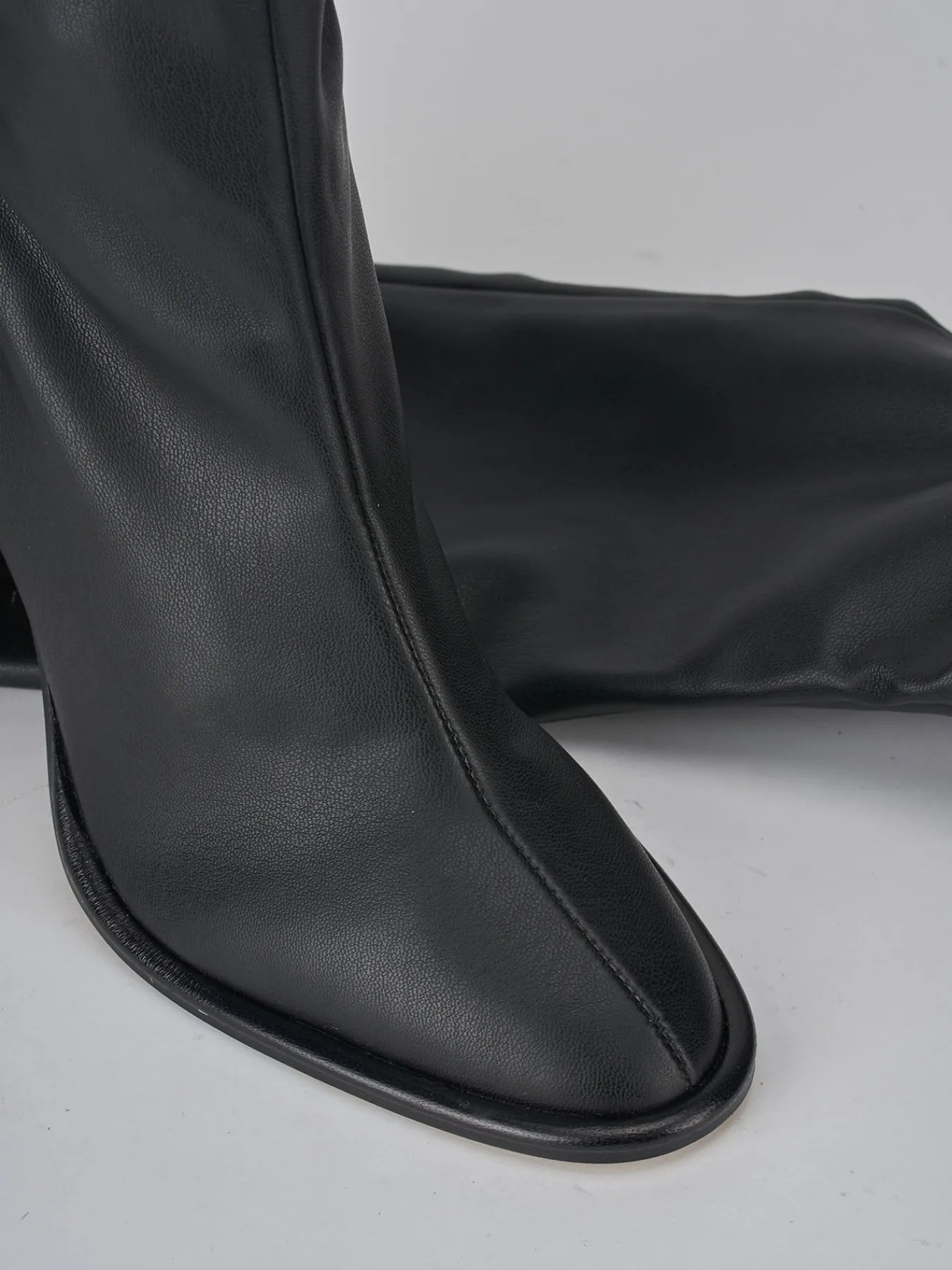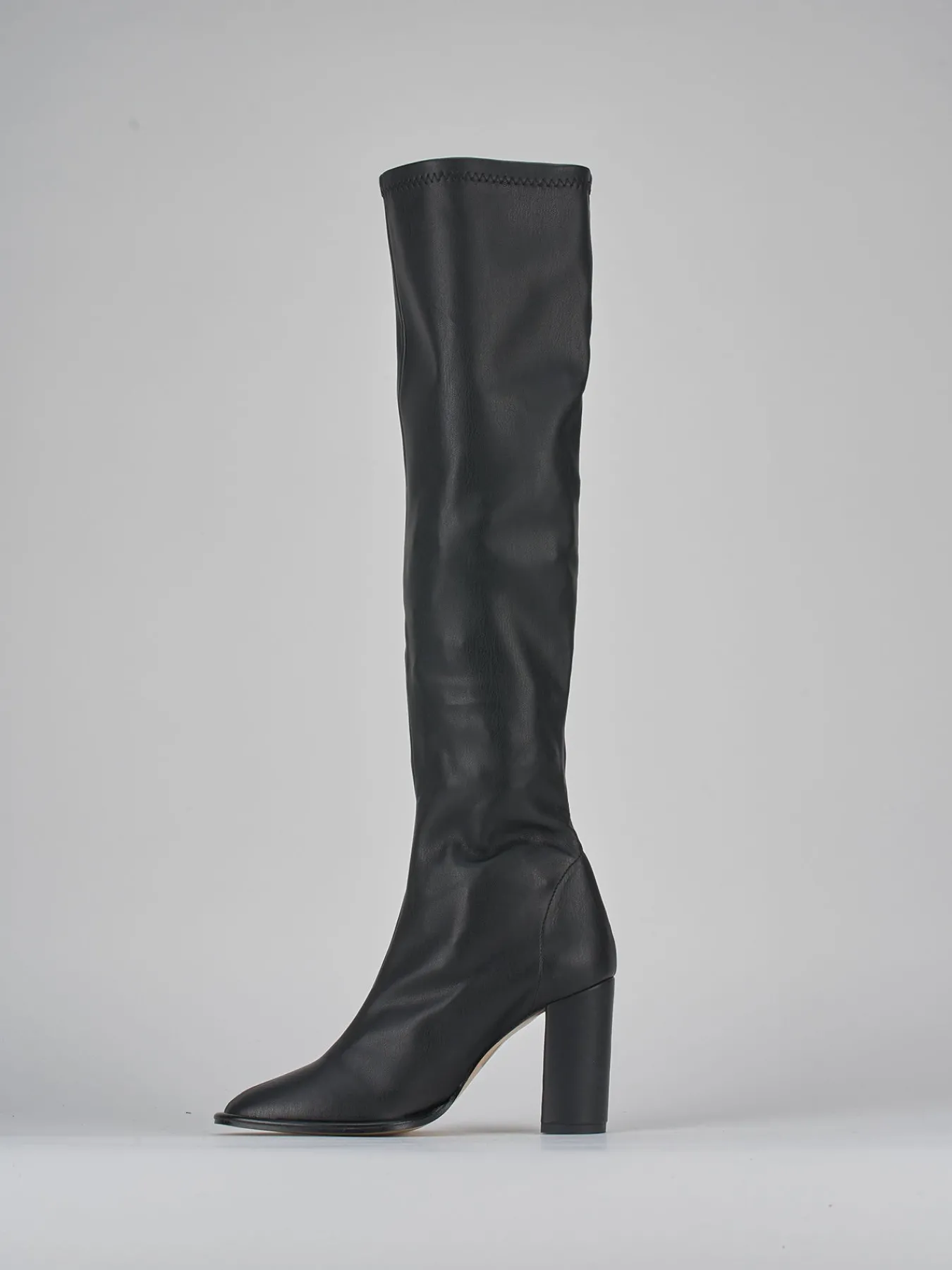stivale tacco 8 cm fondo in leggera gomma e soletto interno in vera pelle. tomaia in morbida pelle stretch, punta affusolata, cuciture a vista, gambale sfoderato aderente che misura appena sopra il ginocchio. guardolo sporgente e tacco grosso per un look che non passa mai di moda.