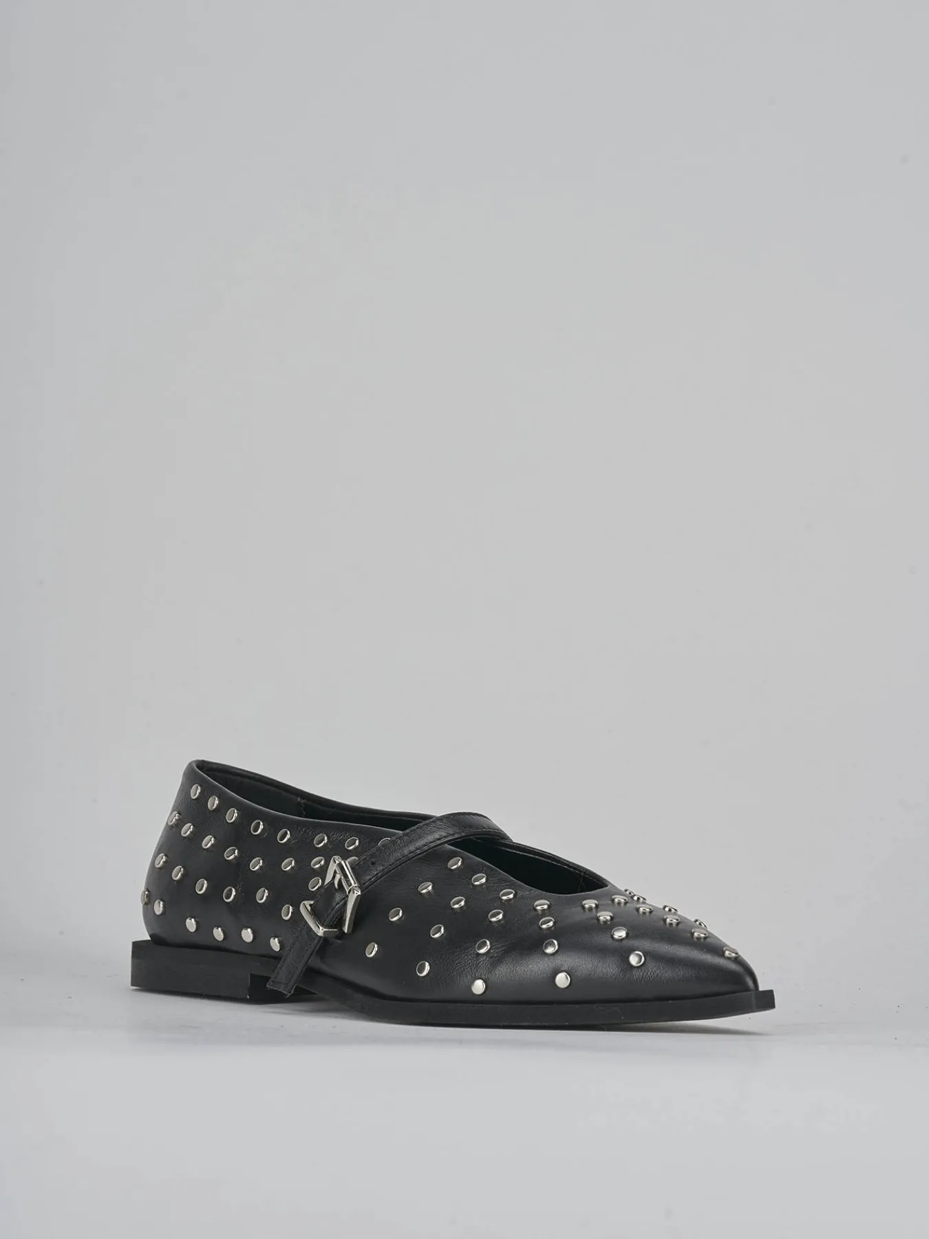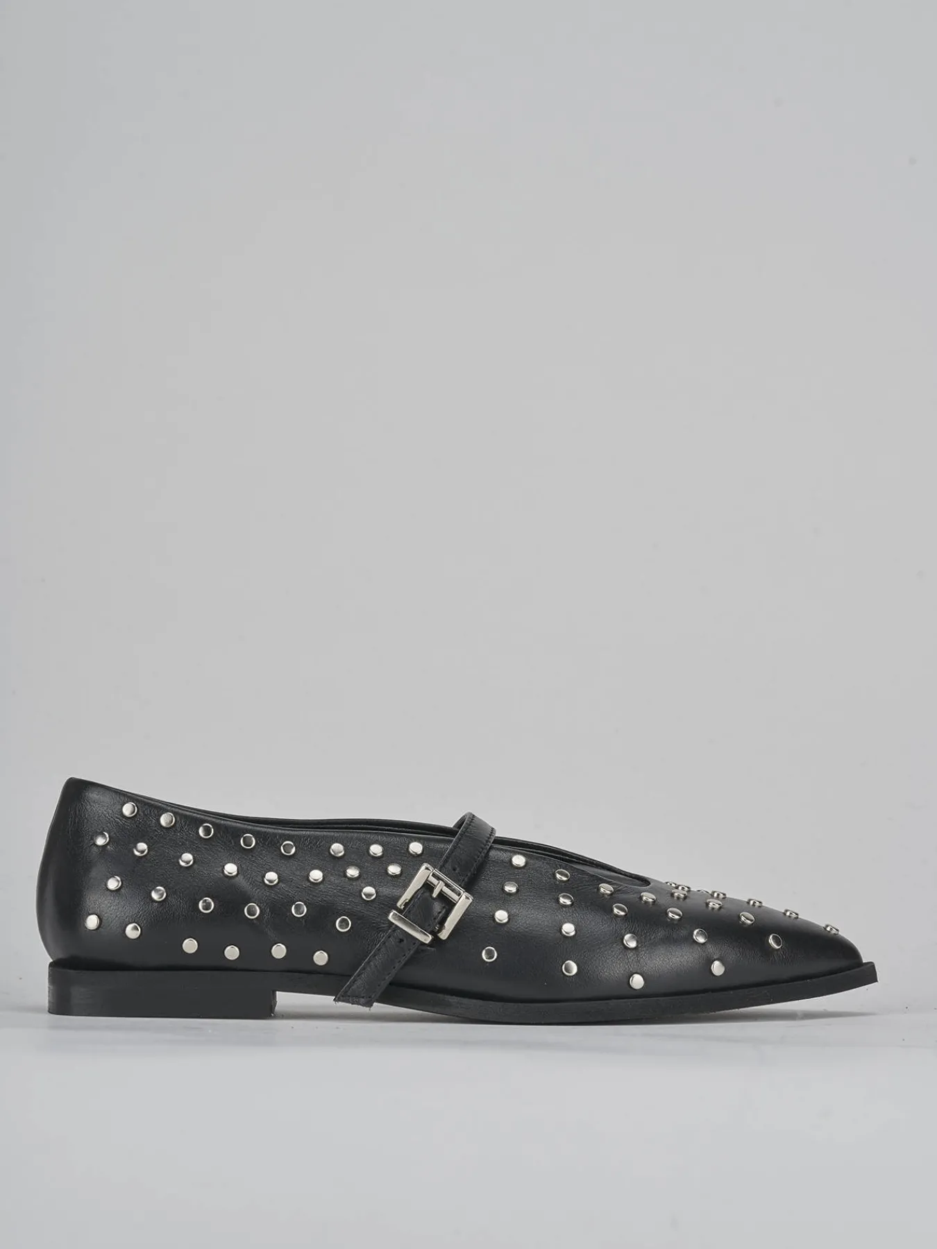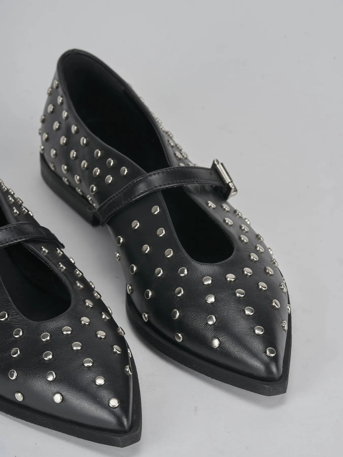 Le piccole borchie distribuite sulla superficie aggiungono un dettaglio grintoso, mentre il cinturino con fibbia regolabile sul collo del piede offre un tocco di stile e praticità.