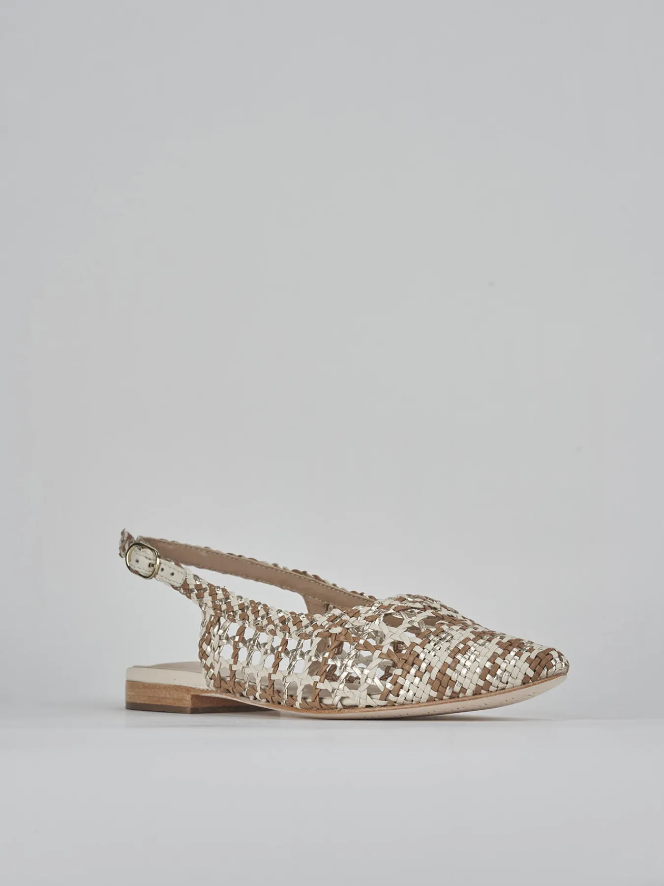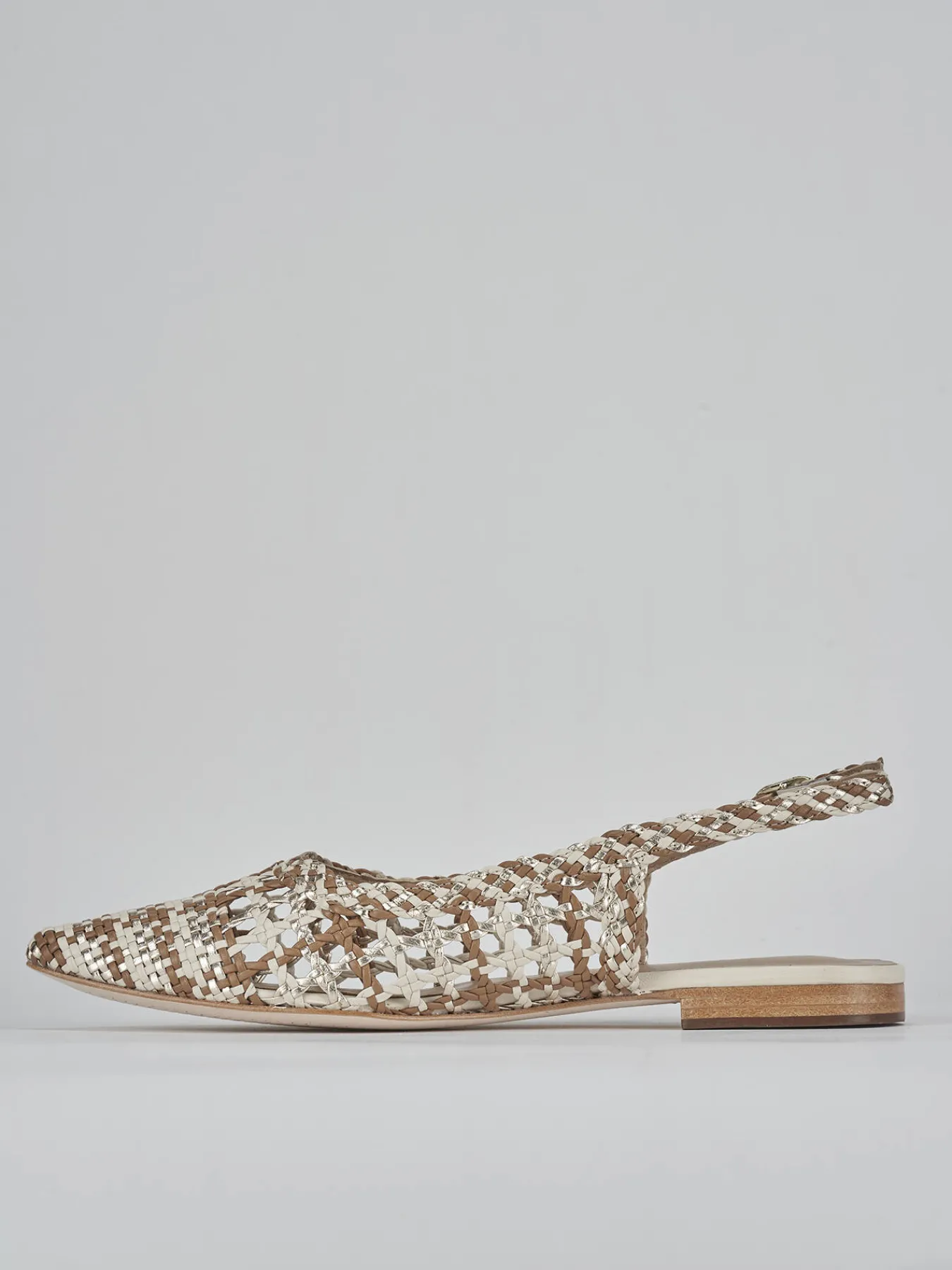Realizzate in morbida pelle beige, queste scarpe esaltano un design finemente intrecciato tricolor che cattura l’attenzione.