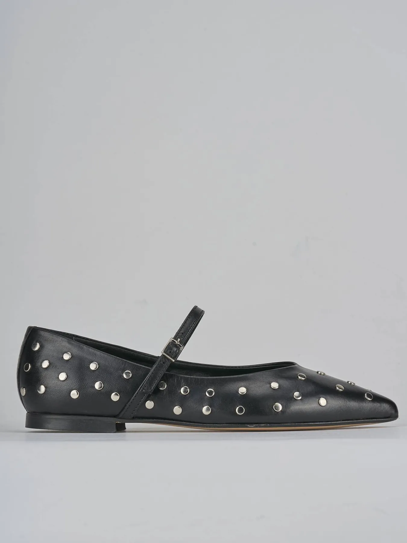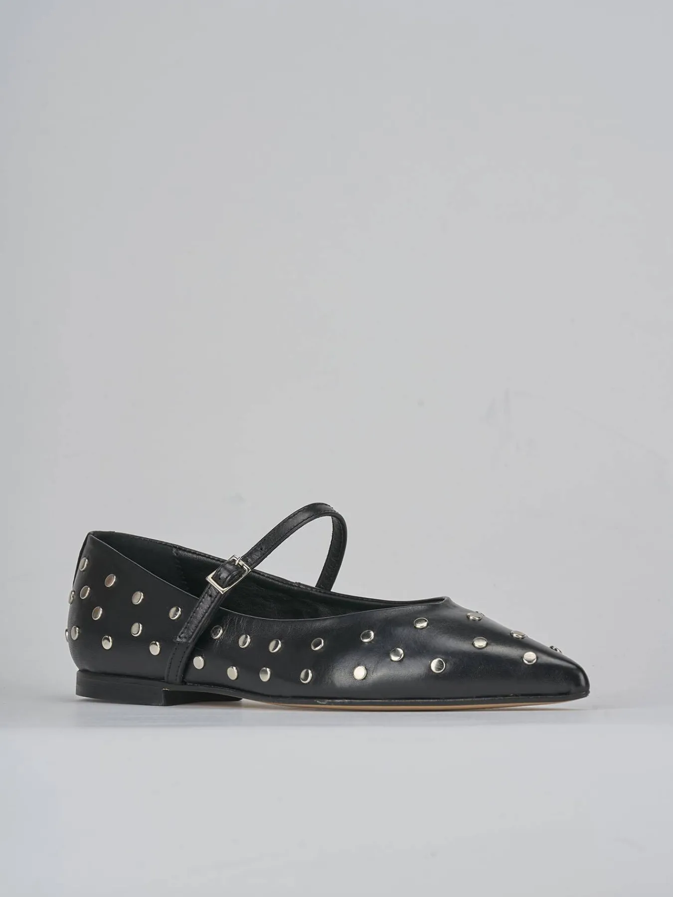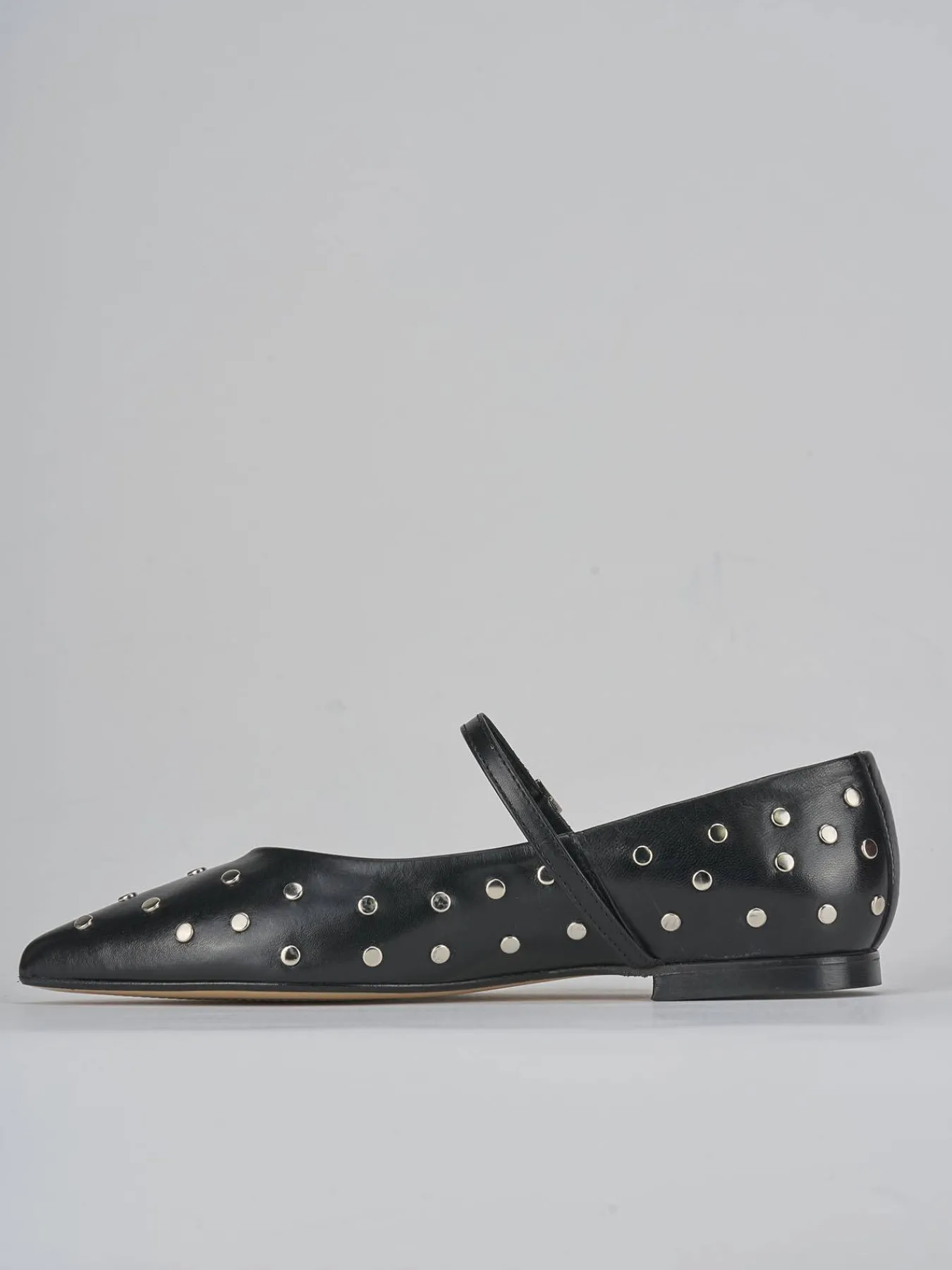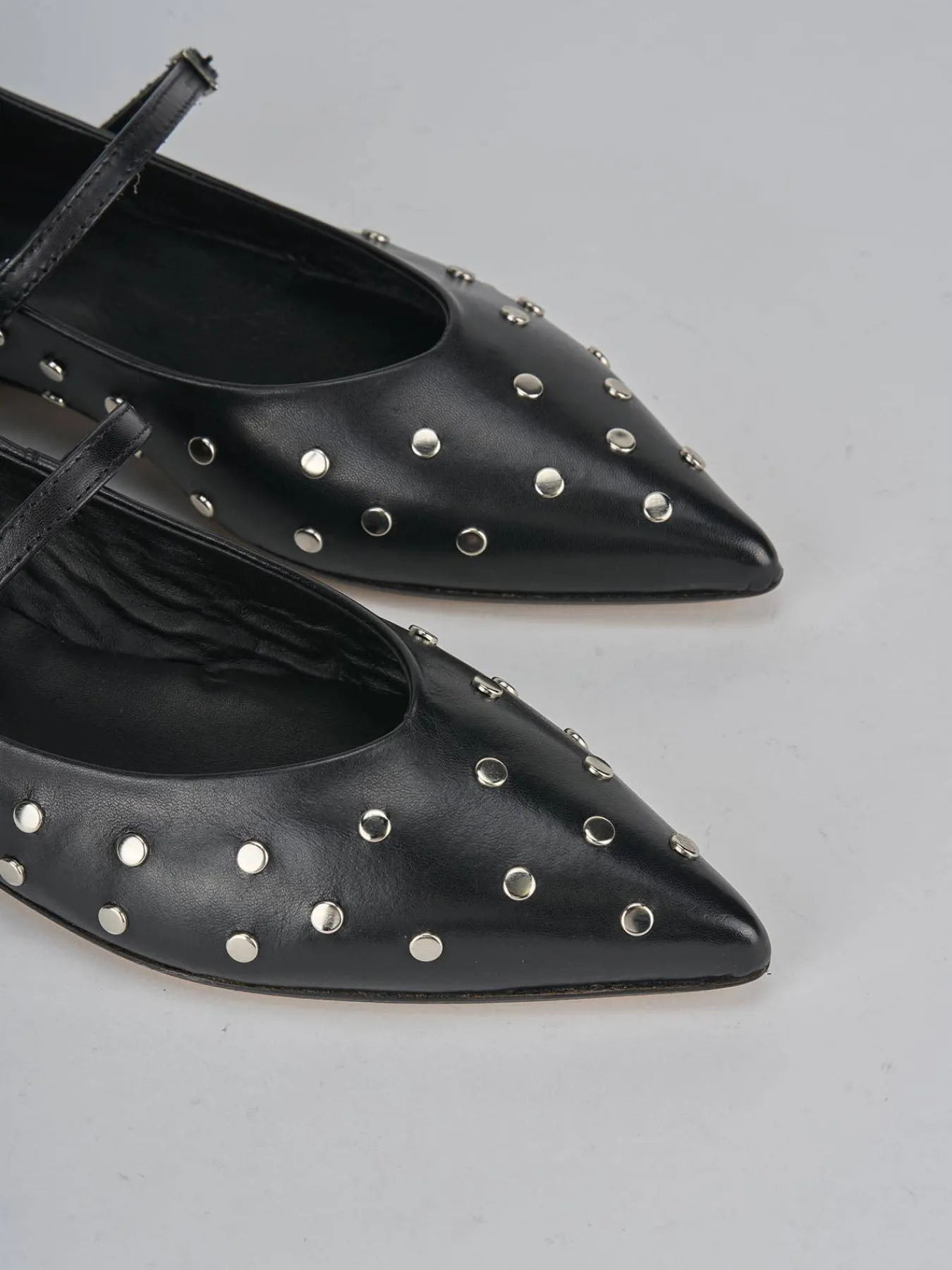 Il design presenta una punta sfilata e uno scollo a ‘U’, arricchito da borchie che donano un tocco di modernità e stile.