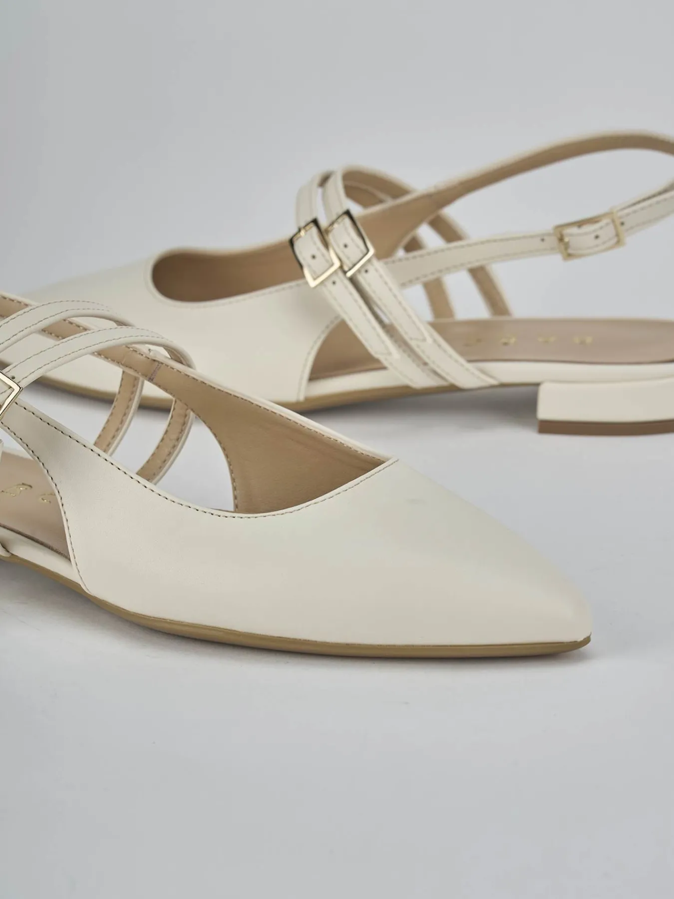 Ballerina tacco 2 cm fondo in leggerissima gomma e soletto interno in vera pelle. Tomaia in morbida pelle, punta sfilata, scollo leggermente squadrato, due cinturini sul collo del piede e uno sul tallone con fibbia regolabile per un look semplice ma elegante.
