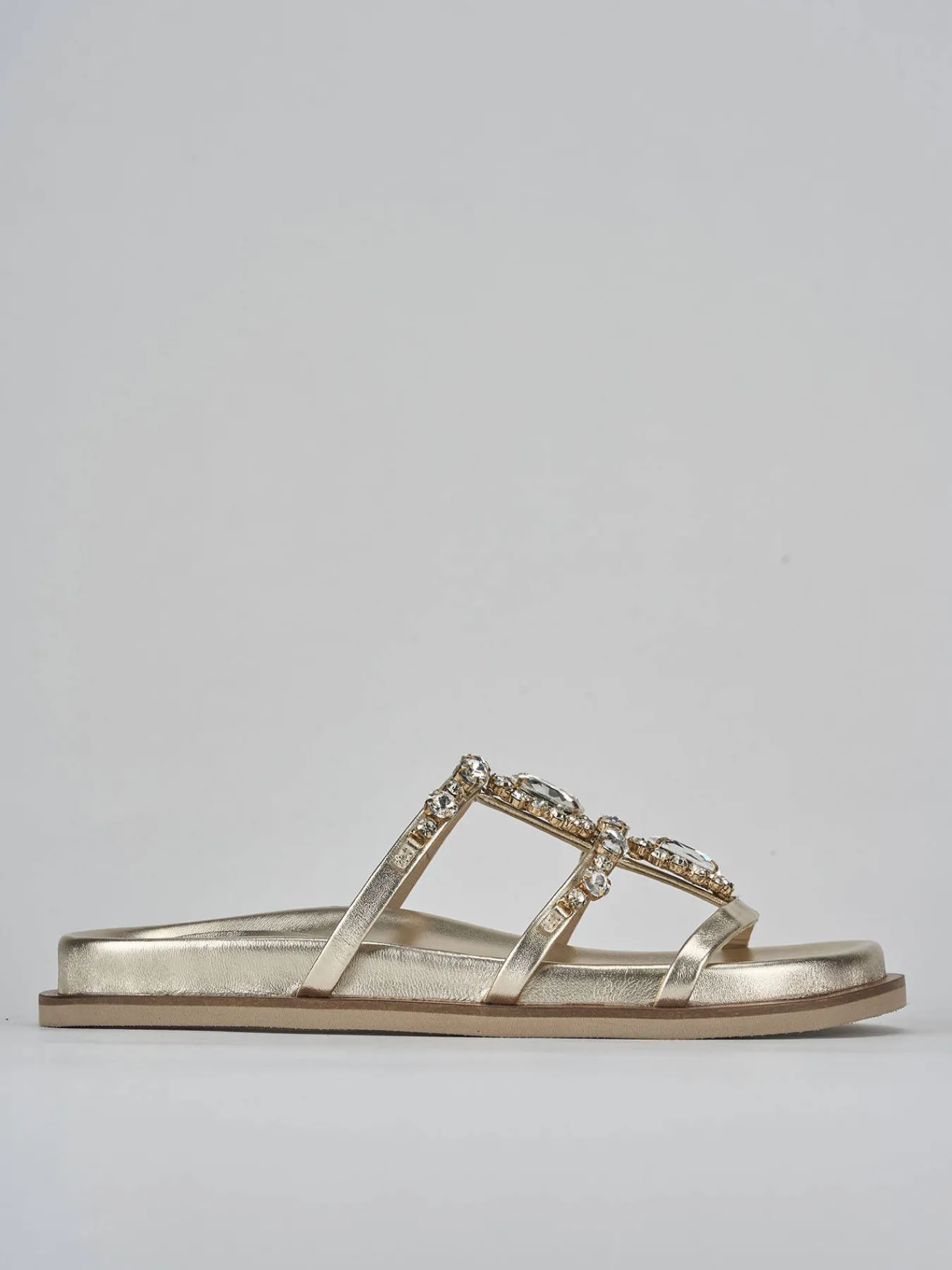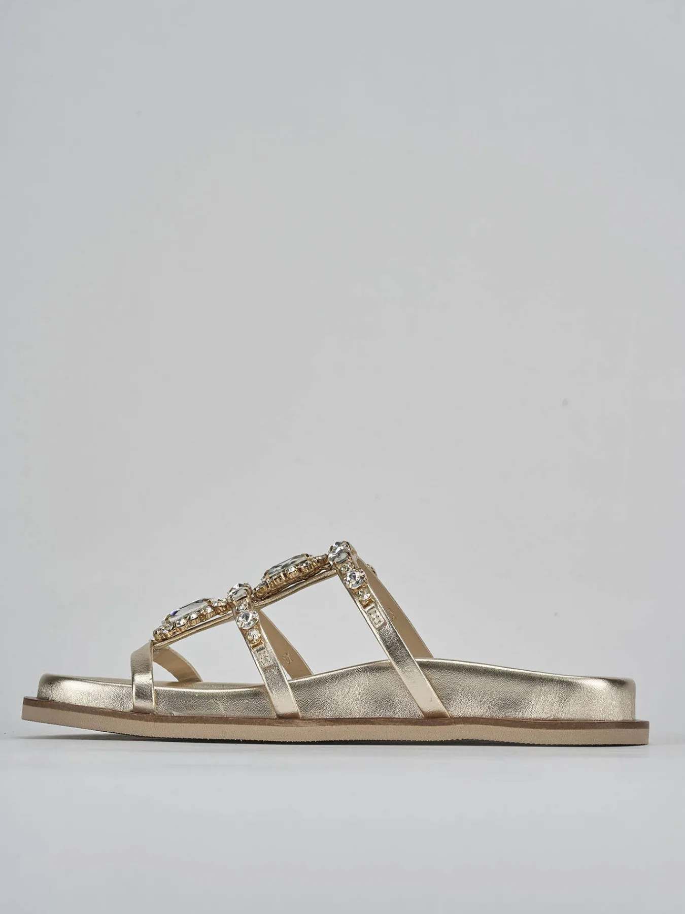 Realizzate in morbida pelle laminata, queste ciabatte presentano tre fascette mignon impreziosite da luminosissime pietre strass, che aggiungono un tocco di raffinatezza ad ogni passo.