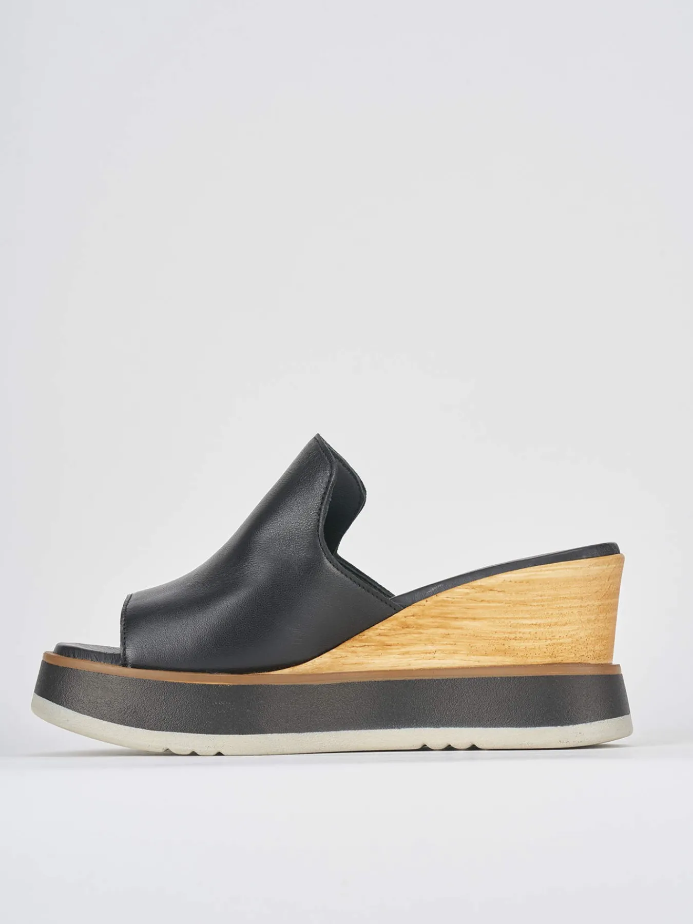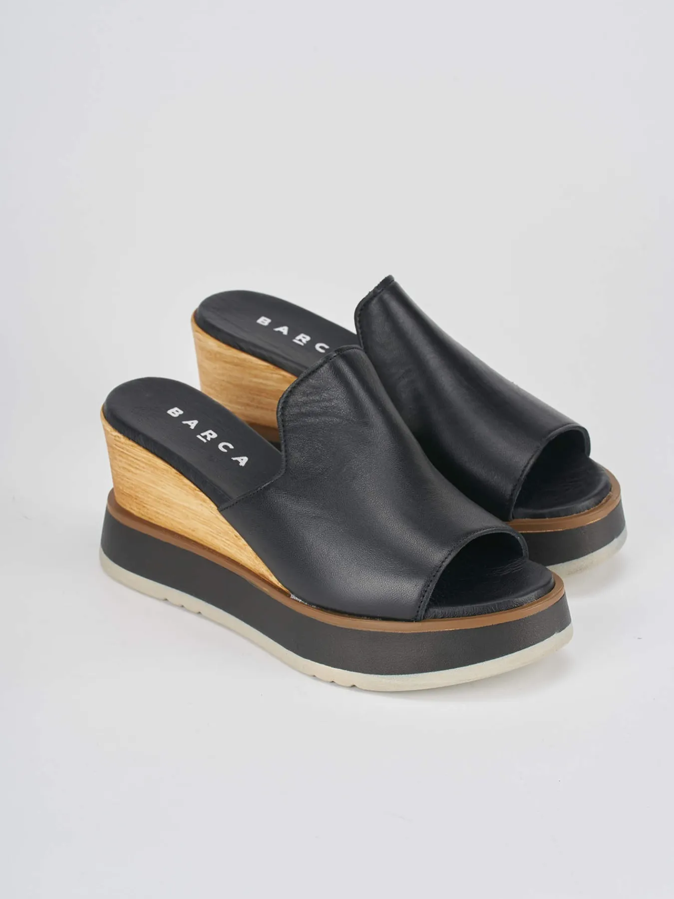 Ciabatta zeppa 9cm fondo in gomma e soletto interno in vera pelle. Tomaia in morbida nappa con geometrie svasate e zeppa effetto legno con plato anteriore alto 3cm. So cool!