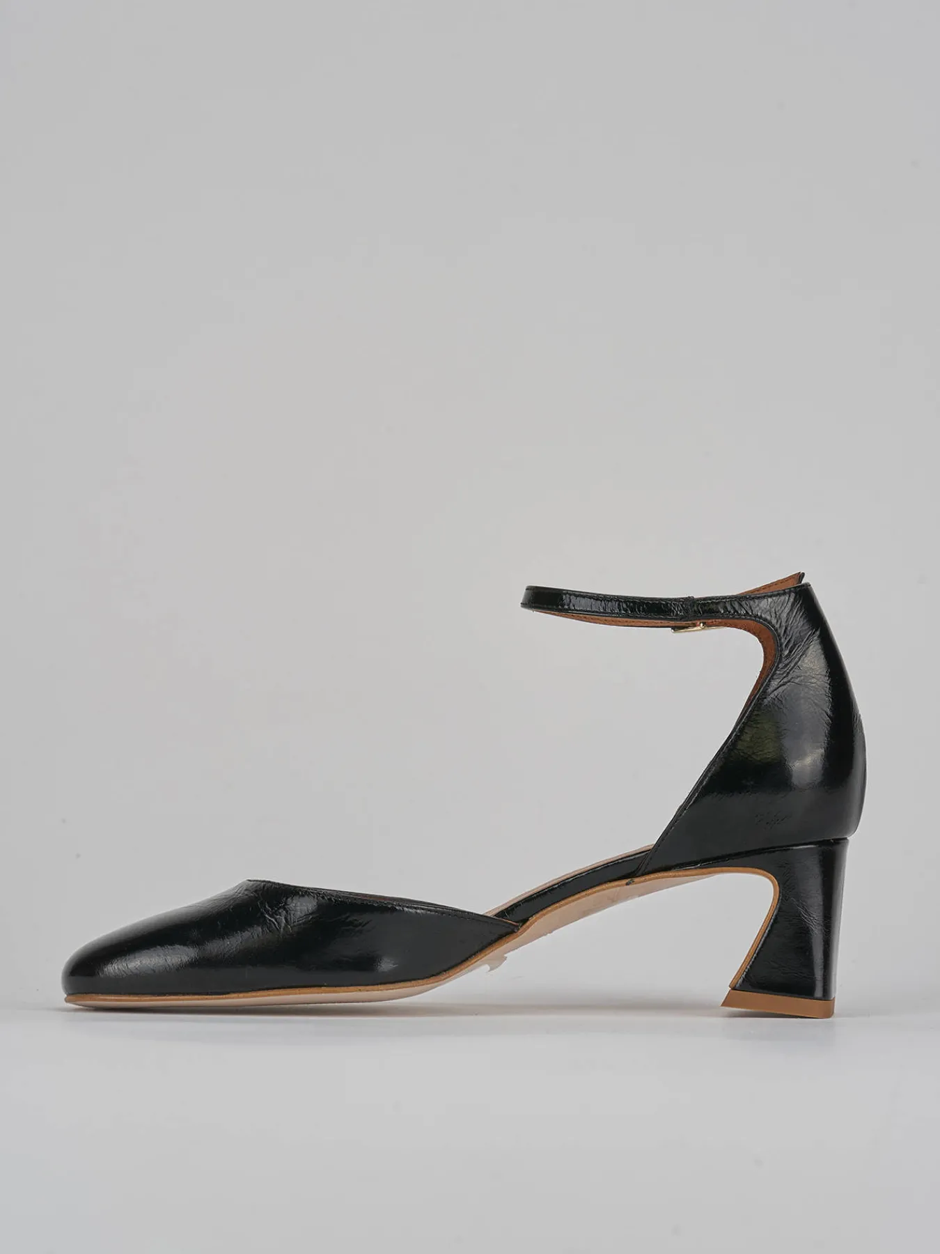 Bebe’ tacco 5 cm fondo in cuoio e soletto interno in vera pelle. Tomaia in morbida pelle effetto verniciato, punta leggermente squadrata, scollo svasato, cinturino in caviglia con fibbia regolabile e nuovissimo tacco rocchetto. perfetto con una gonna o dei jeans vintage.