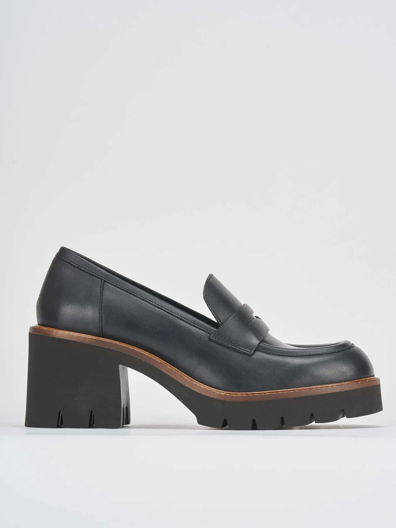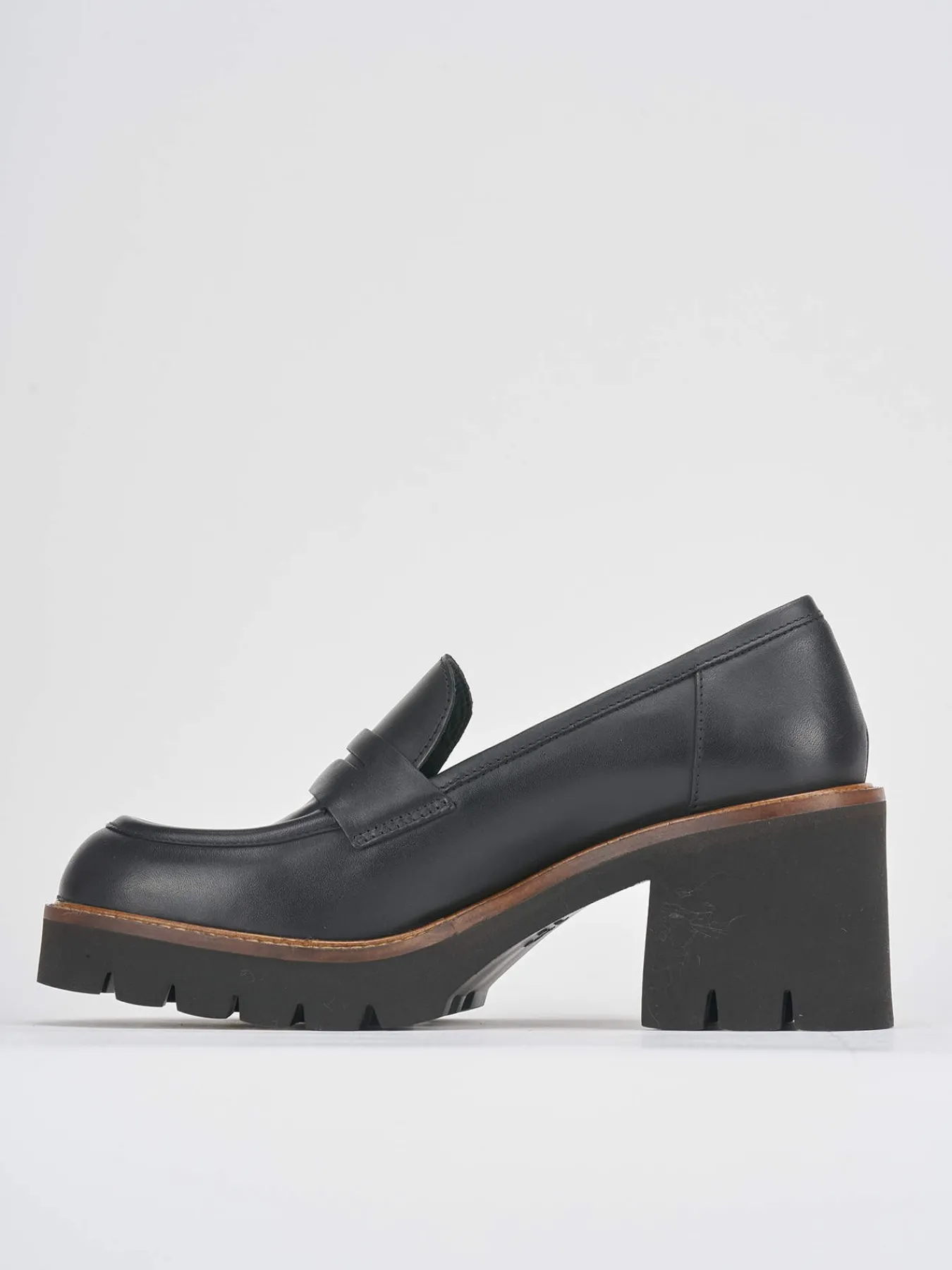 Mocassino tacco 5 cm fondo in gomma e soletto interno in vera pelle. Tomaia in morbida pelle, punta leggermente squadrata, mascherina a bocca di leone e bordo a contrasto per un look cool.