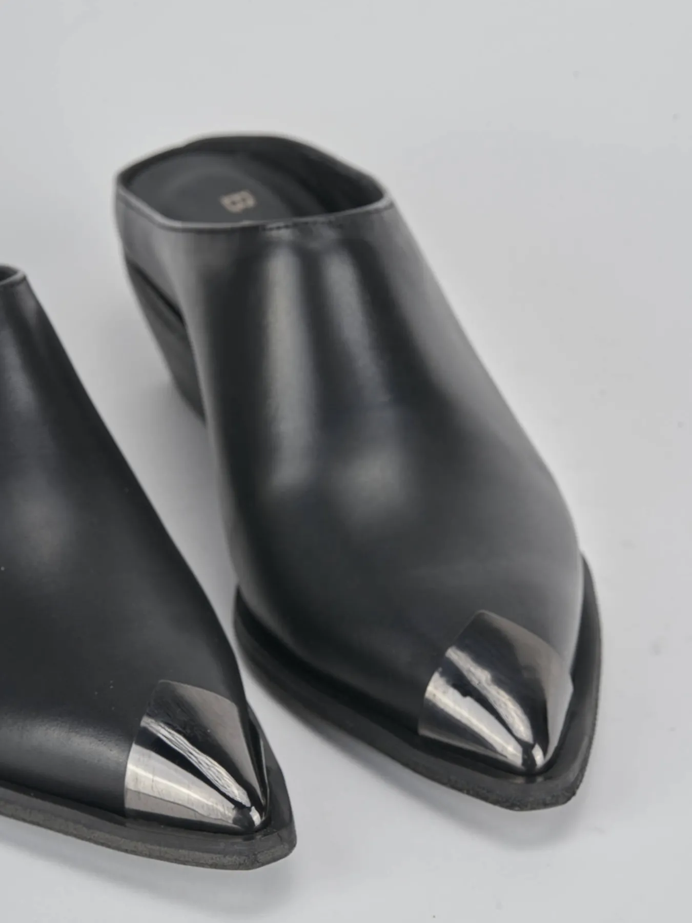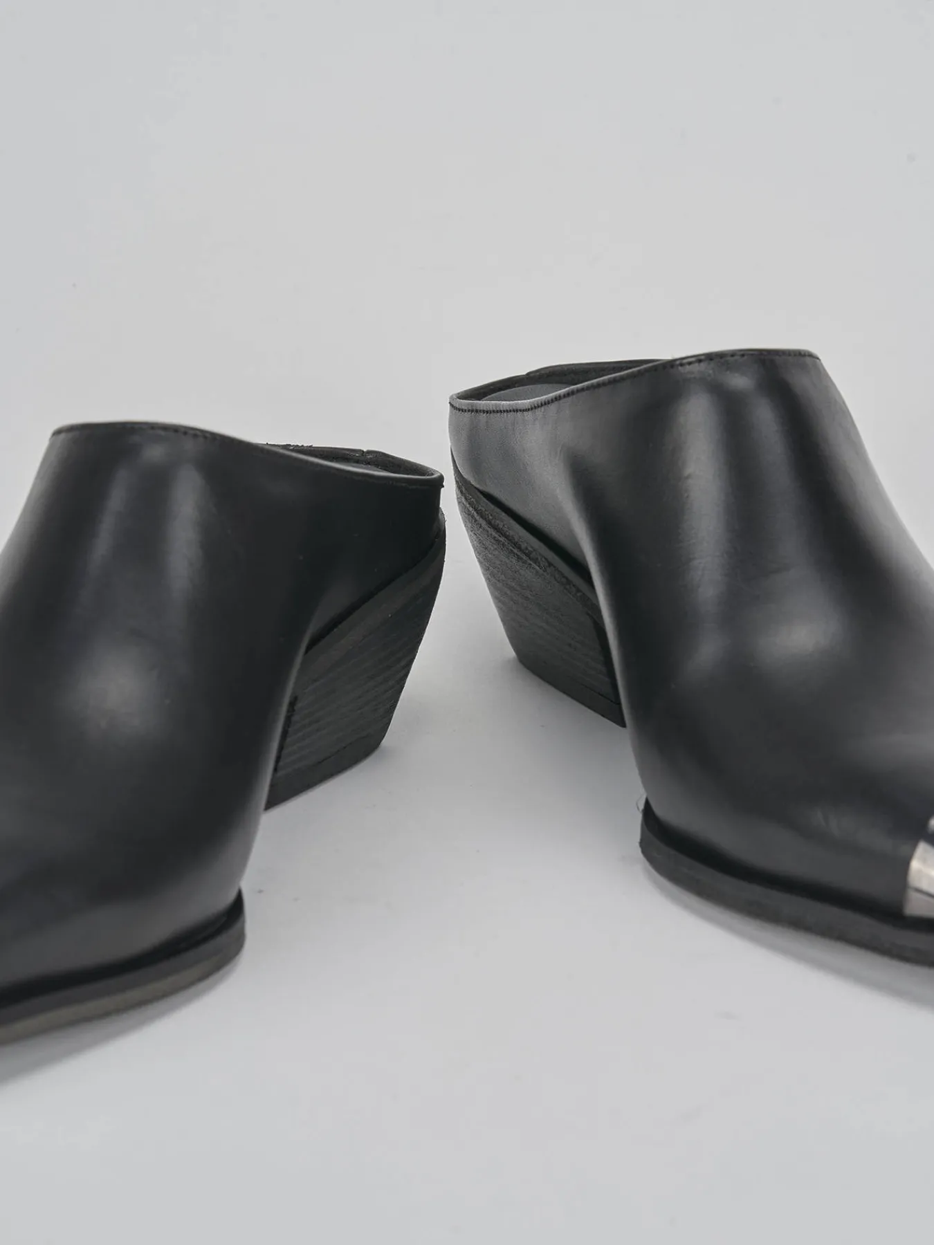 Sabot tacco 4 cm, fondo in gomma e soletto interno in vera pelle. Tomaia in morbida pelle, punta sfilata, puntale in metallo, fascia unica, comodo tacco grosso e guardolo sporgente per un look chic.