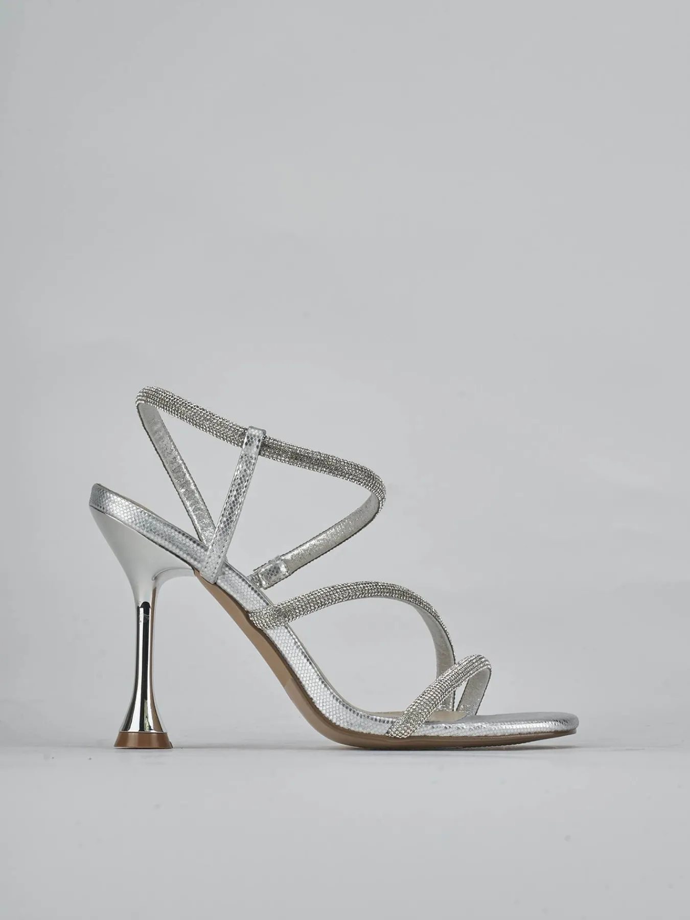 La punta squadrata e le fasce arricchite da strass donano un fascino glamour e moderno.