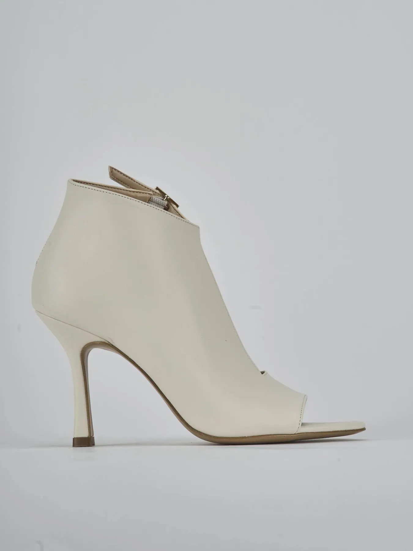 Stivaletto tacco 9 cm fondo in leggerissima gomma e soletto interno in vera pelle. Tomaia in morbida pelle, punta sfilata e aperta, lato esterno chiuso, cinturino con fibbia regolabile e tacco rocchetto per un look cool.
