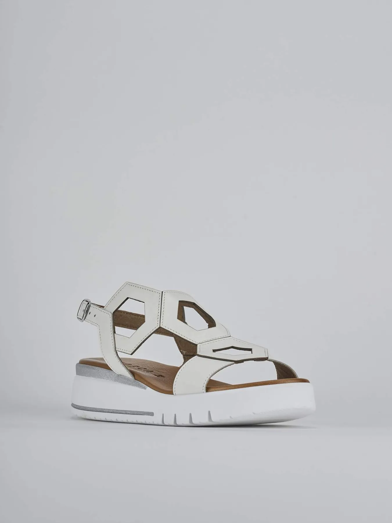 Sandalo zeppa 3 cm fondo in leggera gomma e soletto interno in vera pelle. Tomaia in morbida pelle, punta affusolata, fascette geometriche e cinturino con fibbia regolabile.
