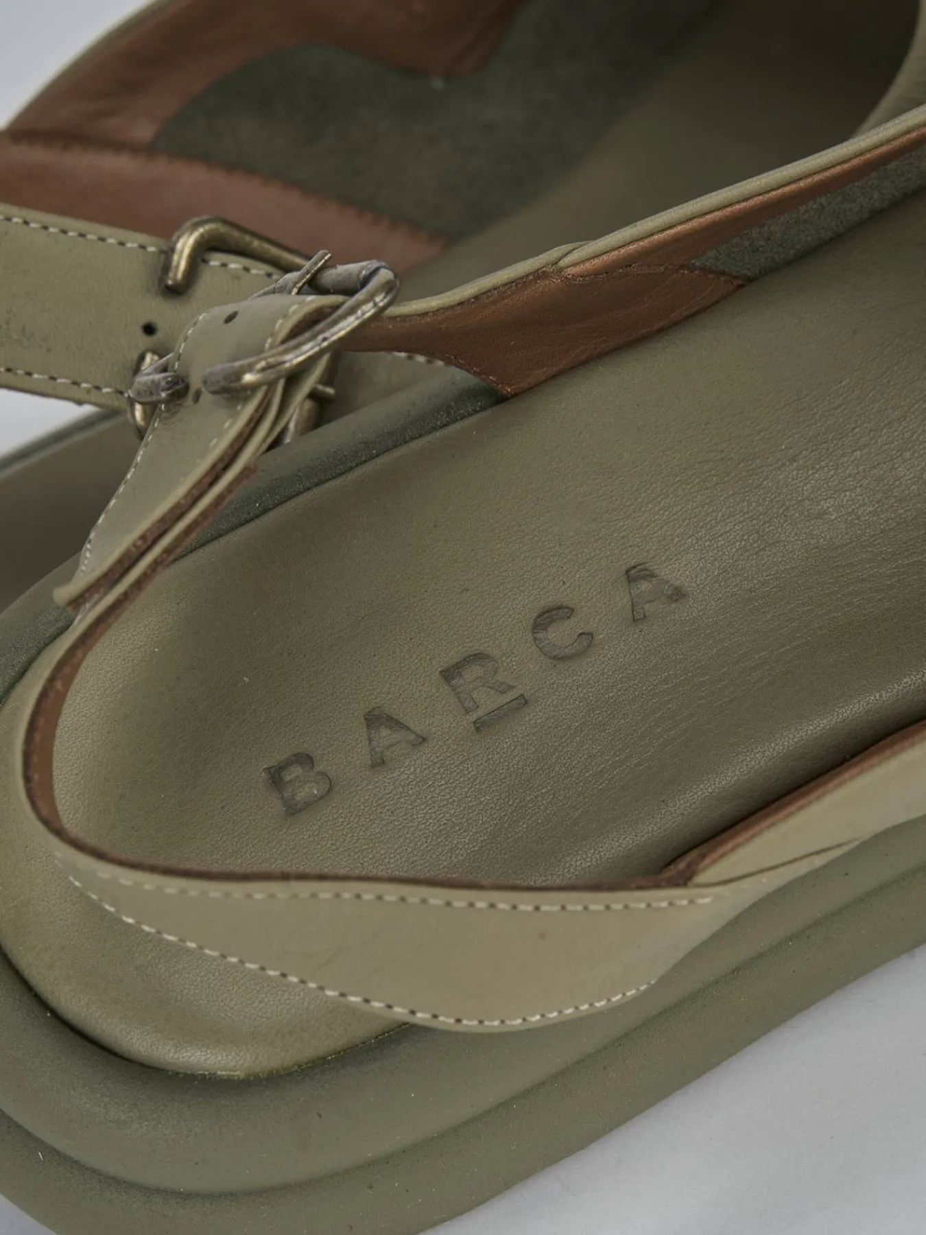 Sandalo tacco 3 cm e fondo in leggerissima gomma e soletto interno in vera pelle. Tomaia in morbida pelle, punta affusolata, fascia unica con taglio particolare, scollo a ‘U’, cinurino con fibbia regolabile e fondo cool.