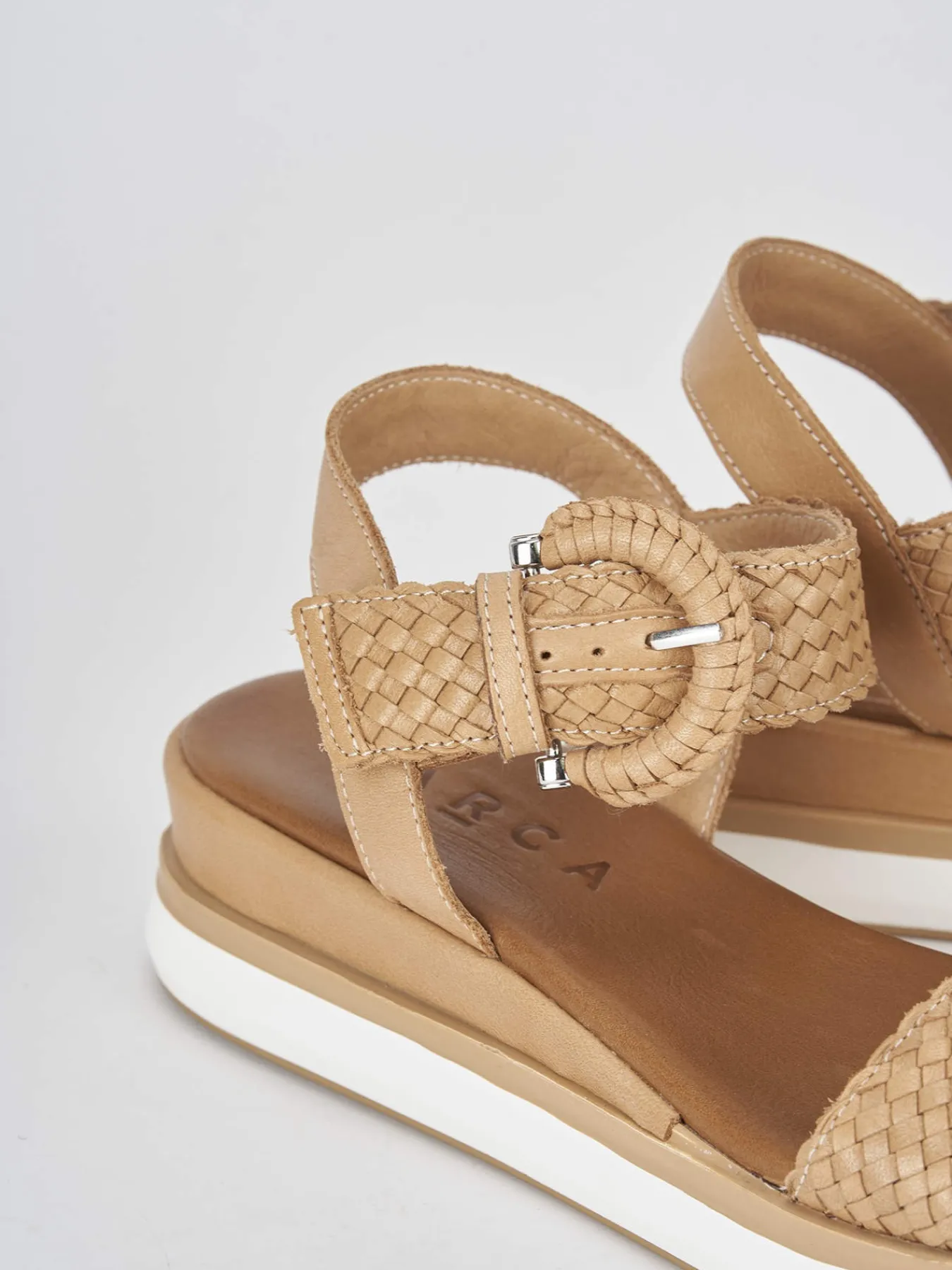 sandalo zeppa 3 cm fondo in leggera gomma e soletto interno in vera pelle. tomaia in morbida pelle, fascia unica intrecciata, cinturino con fibbia con pelle intrecciata e doppio fondo. perfetto per ogni tua occasione.