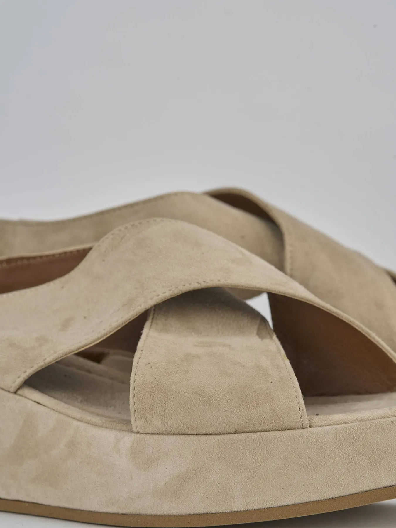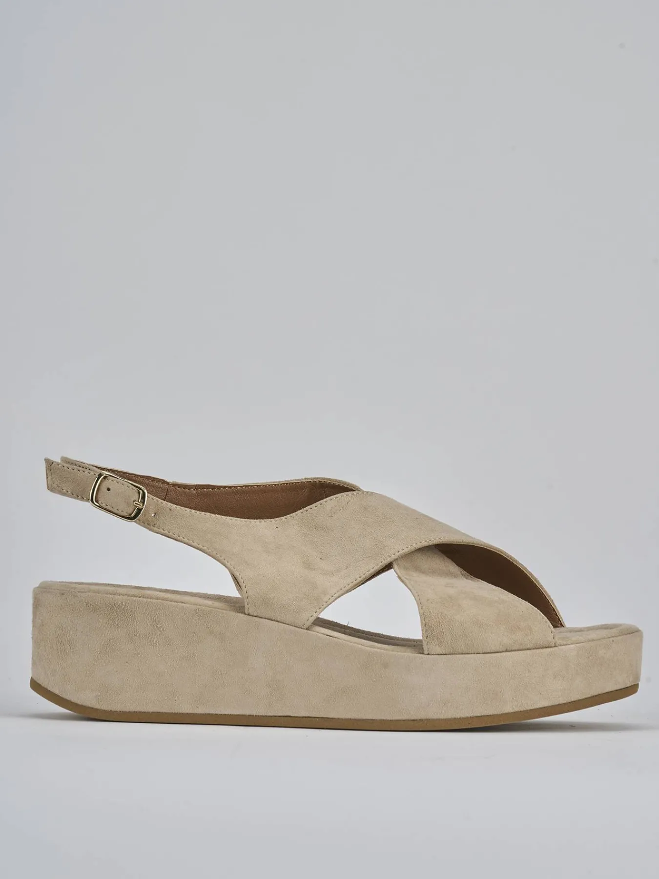 Sandalo zeppa 4 cm fondo in cuoio e soletto interno in vera pelle e leggermente imbottito. Tomaia in morbida pelle scamosciata, punta leggermente squadrata, fasce incrociate, cinturino con fibbia regolabile e piccolo plateau anteriore di 1.5 cm . Perfetto con un vestito o una gonna midi.