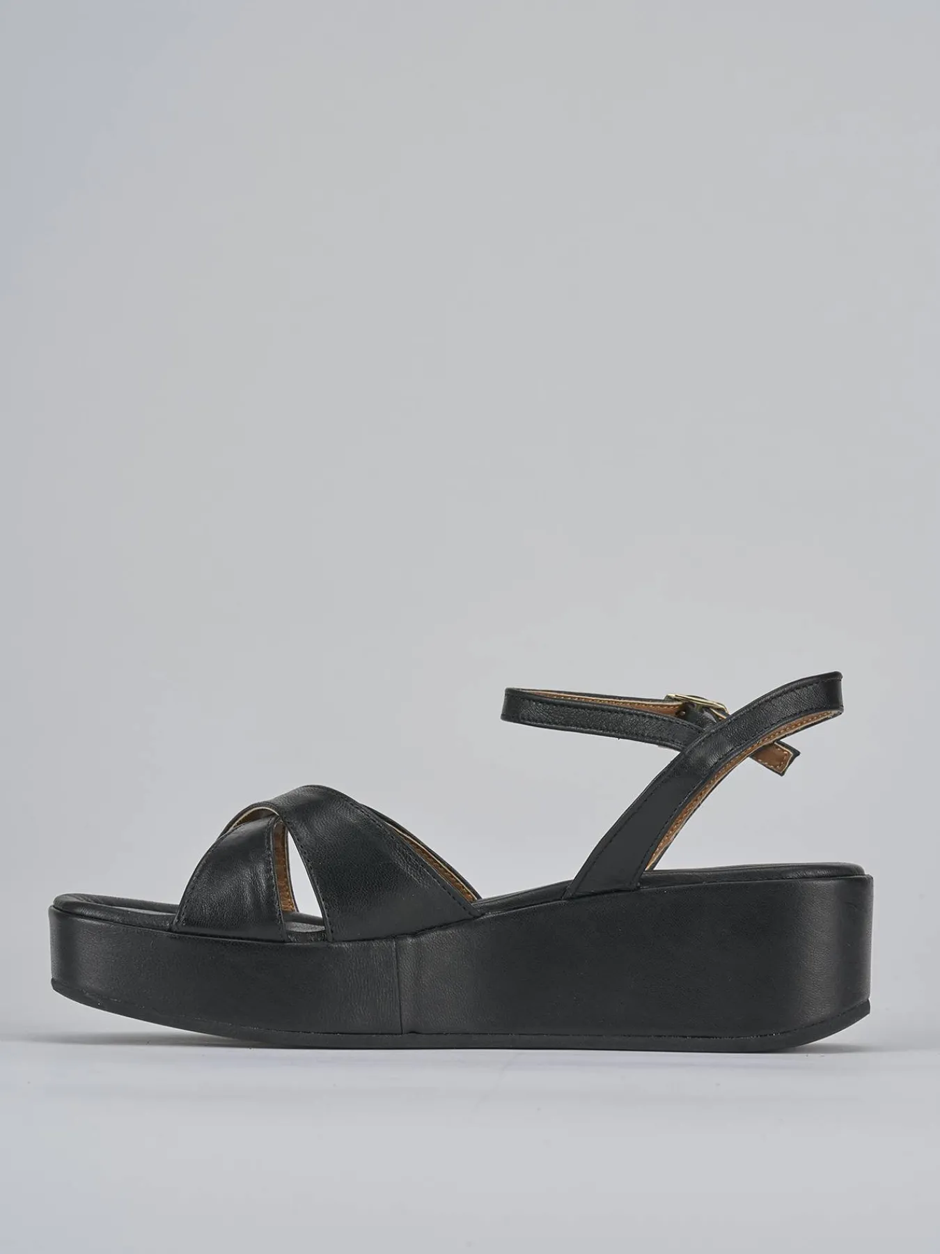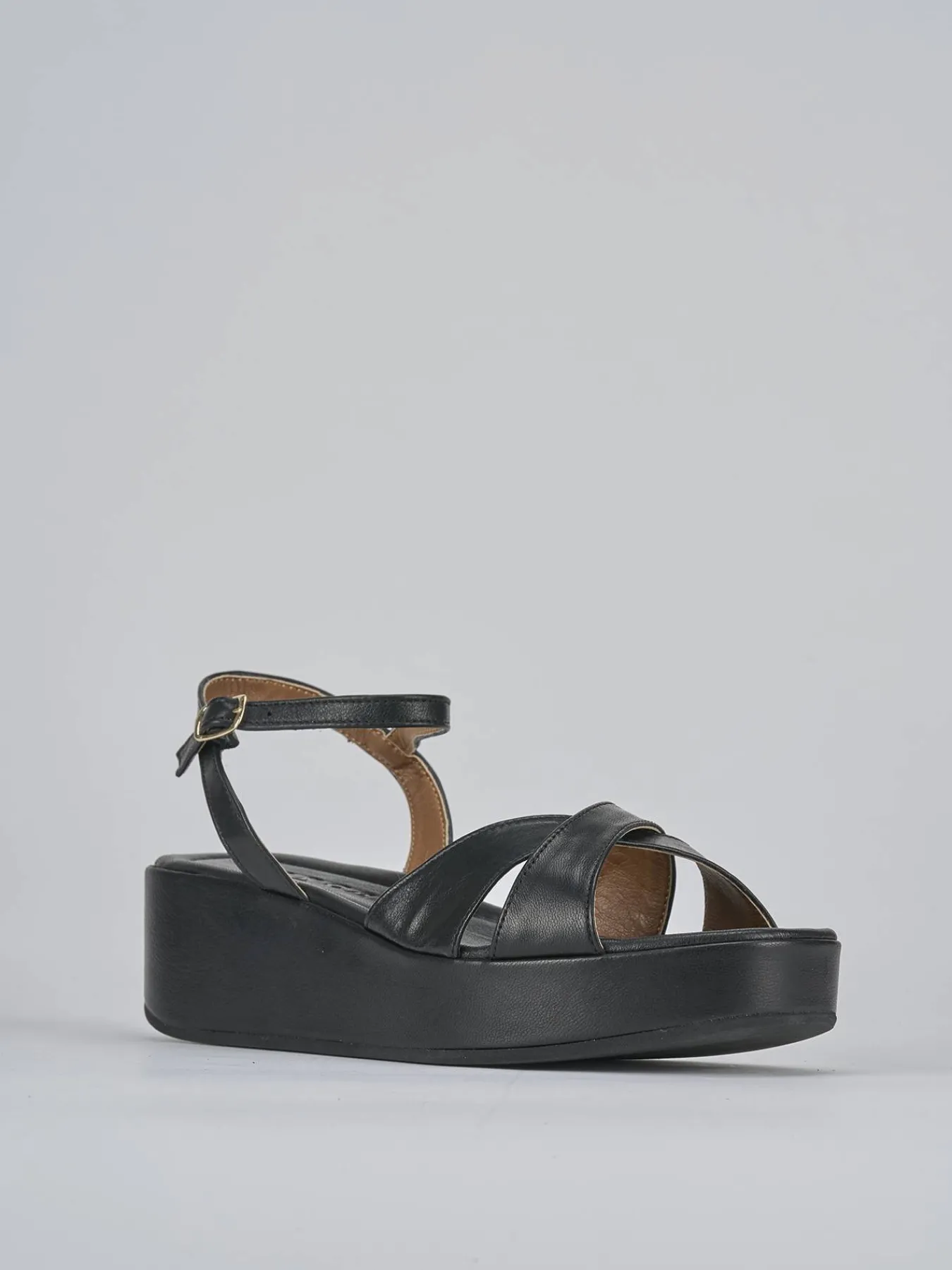 Sandalo zeppa 4 cm fondo in cuoio e soletto interno in vera pelle e leggermente imbottito. Tomaia in morbida pelle, punta leggermente squadrata, fasce incrociate, cinturino con fibbia regolabile e piccolo plateau anteriore di 1.5 cm . Perfetto con un vestito o una gonna midi.