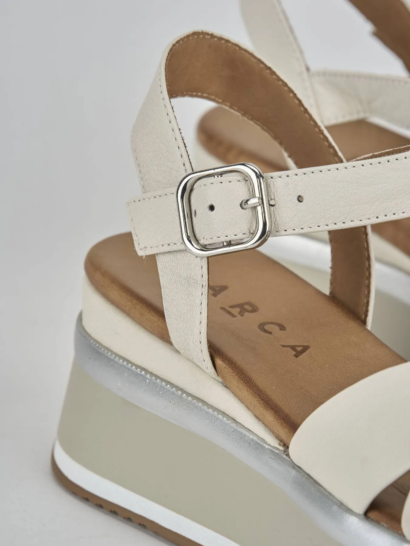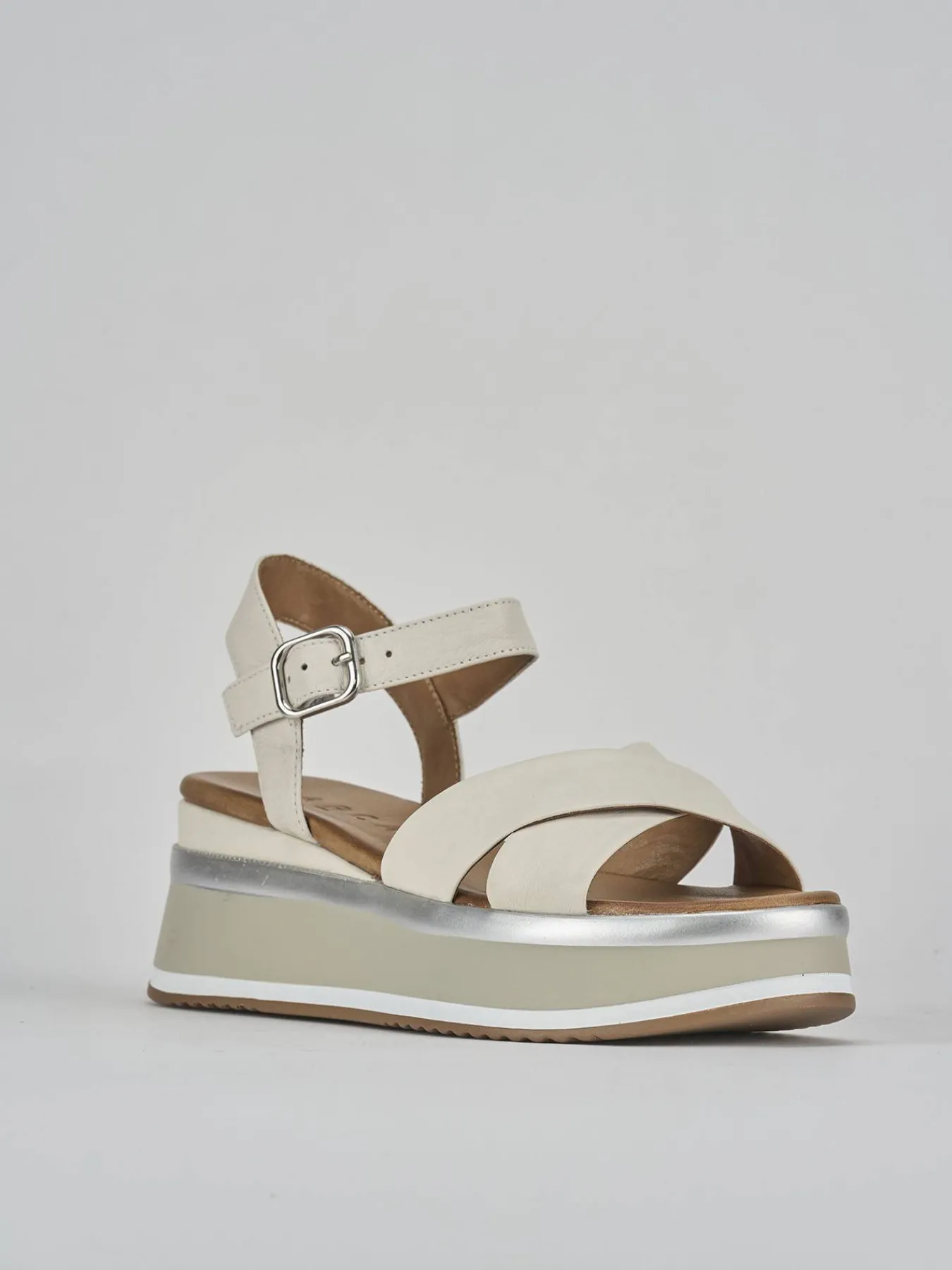 Sandalo zeppa 5 cm fondo in leggerissima gomma e soletto interno in vera pelle. Tomaia in morbida pelle laminata, punta tonda, due fasce incrociate, cinturino con fibbia regolabile per un look cool. Zeppa con dettagli in tinta.