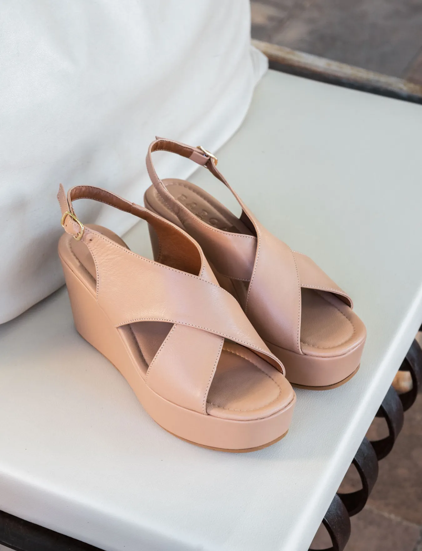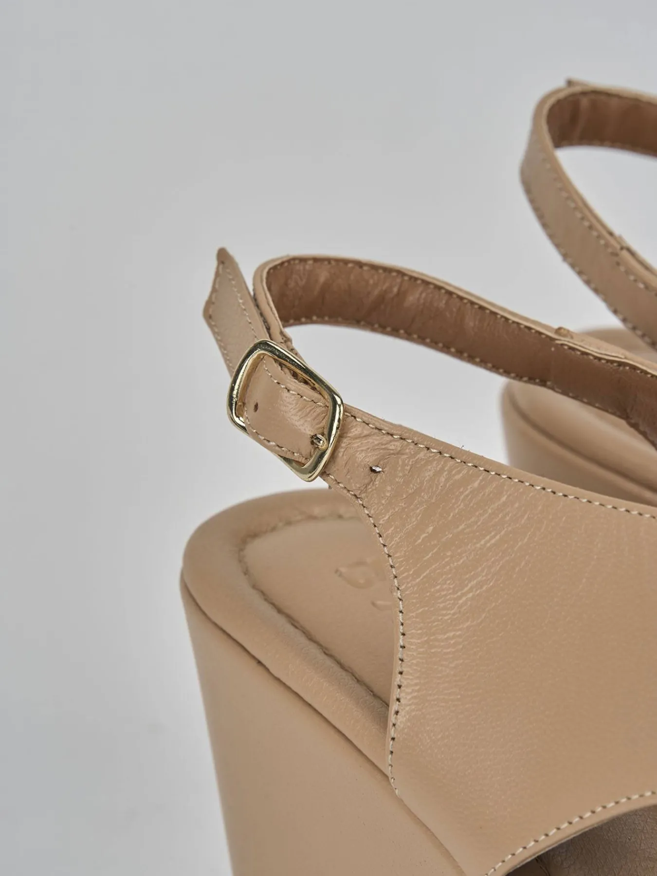 Sandalo zeppa 8 cm fondo in cuoio e soletto interno in vera pelle. Tomaia in morbida pelle, punta affusolata, fasce incrociate, cuciture a mano, e cinturino con fibbia regolabile. Plateau anteriore di 2 cm per il massimo del comfort.