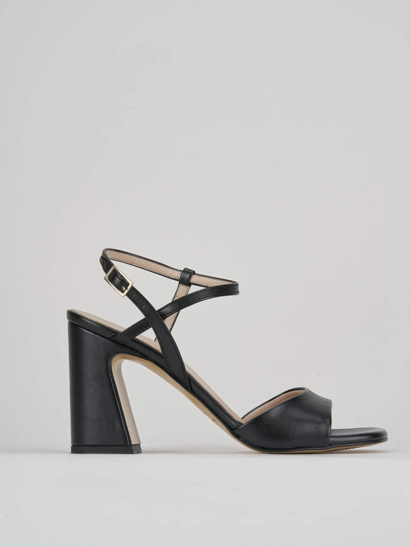 Sandalo tacco 7 cm, fondo in cuoio e soletto interno in vera pelle. Tomaia in morbida pelle, punta squadrata, fascia, cinturino sulla caviglia con fibbia regolabile e tacco grosso per una camminta comoda, giusta con un paio di pantaloni o una gonna per un look chic ed elegante.