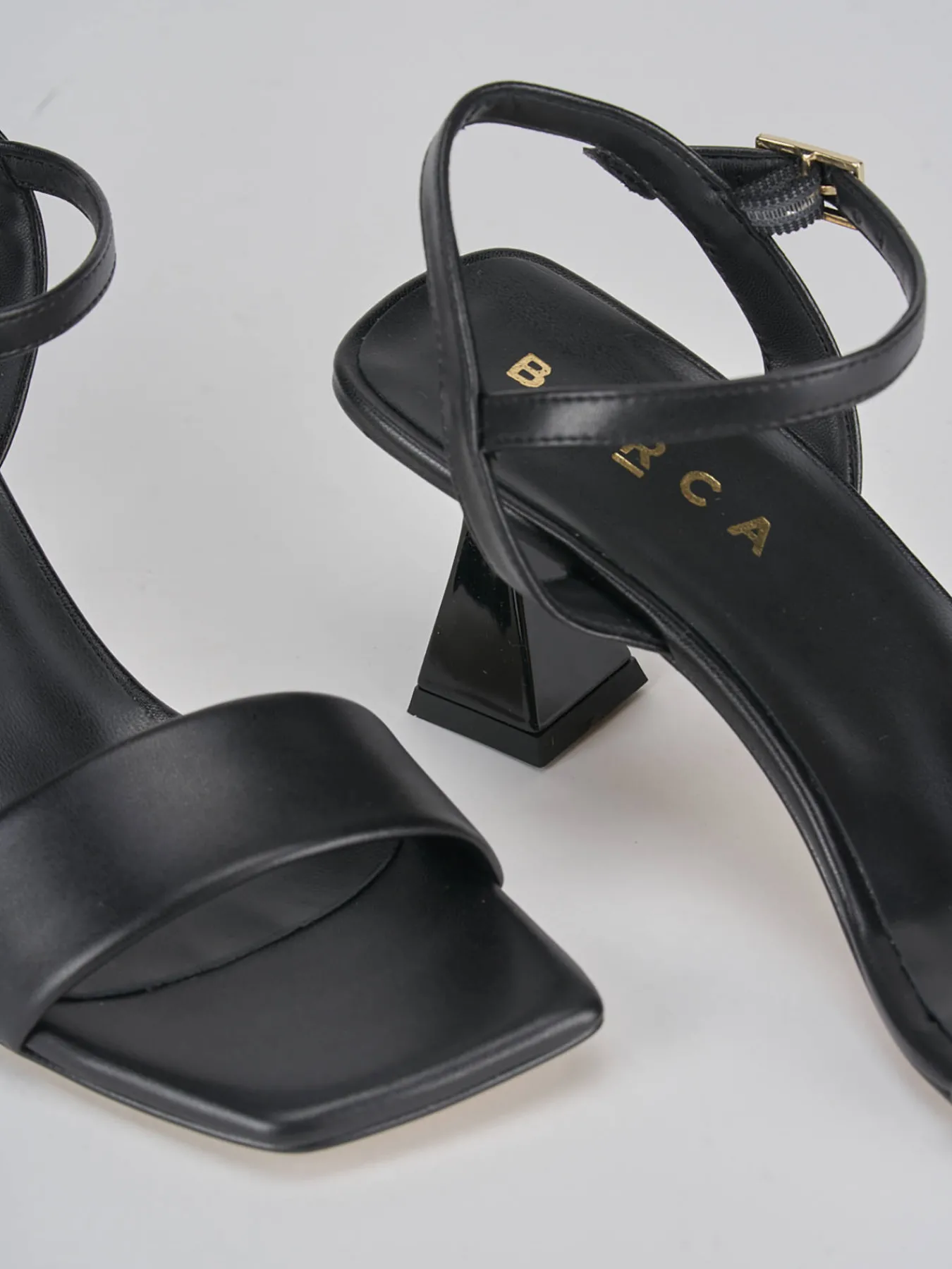 sandalo tacco 7 cm, fondo in leggerissima gomma e soletto interno in vera pelle. Tomaia in morbida pelle, punta squadrata con fascia unica in punta, cinturino con fibia regolabile in caviglia, tallone aperto. Per uno stile cool.