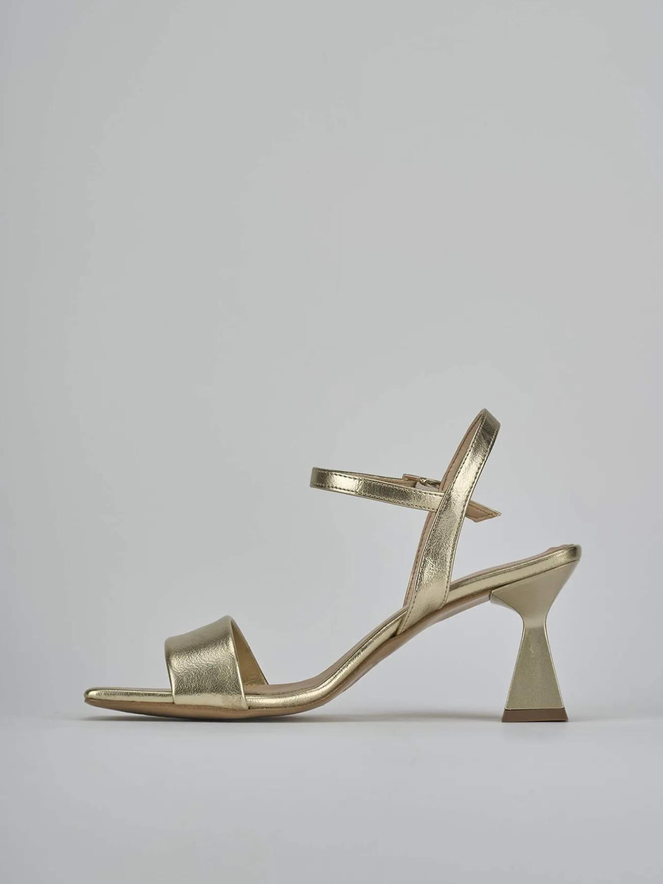 Sandalo tacco 7 cm, fondo in leggerissima gomma e soletto interno in vera pelle. Tomaia in morbida pelle laminata, punta squadrata, fascia unica in punta, cinturino con fibbia regolabile in caviglia e nuovissimo tacco rocchetto per un look chic.
