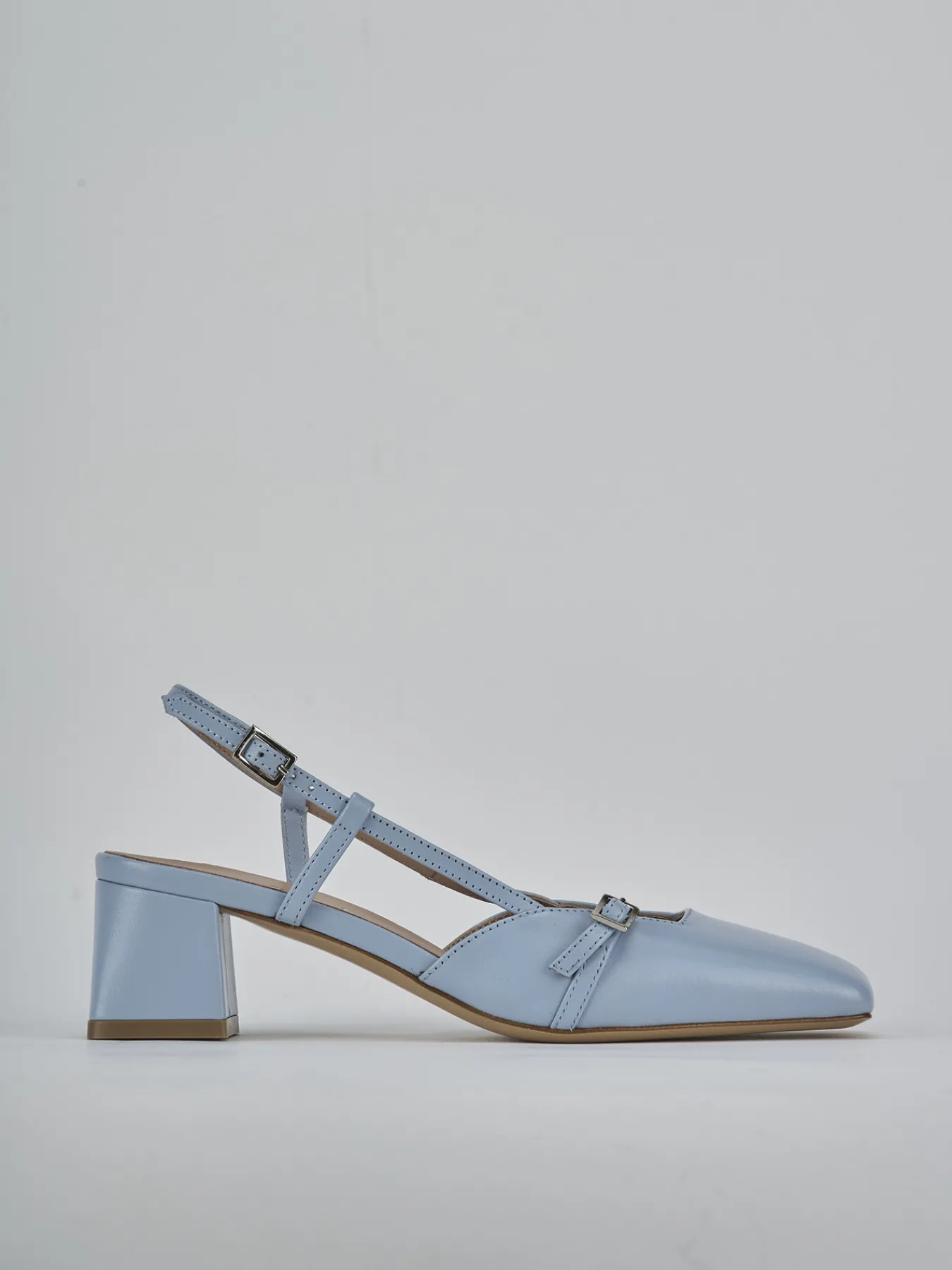 Slingback decolte’ tacco 5 cm fondo in cuoio e soletto interno in vera pelle. Tomaia in morbida pelle, punta sfilata, scollo squadrato, cinturino con fibbia regolabile sulla punta e cinturino sul tallone e tacco grosso. Perfetto con un vestito.