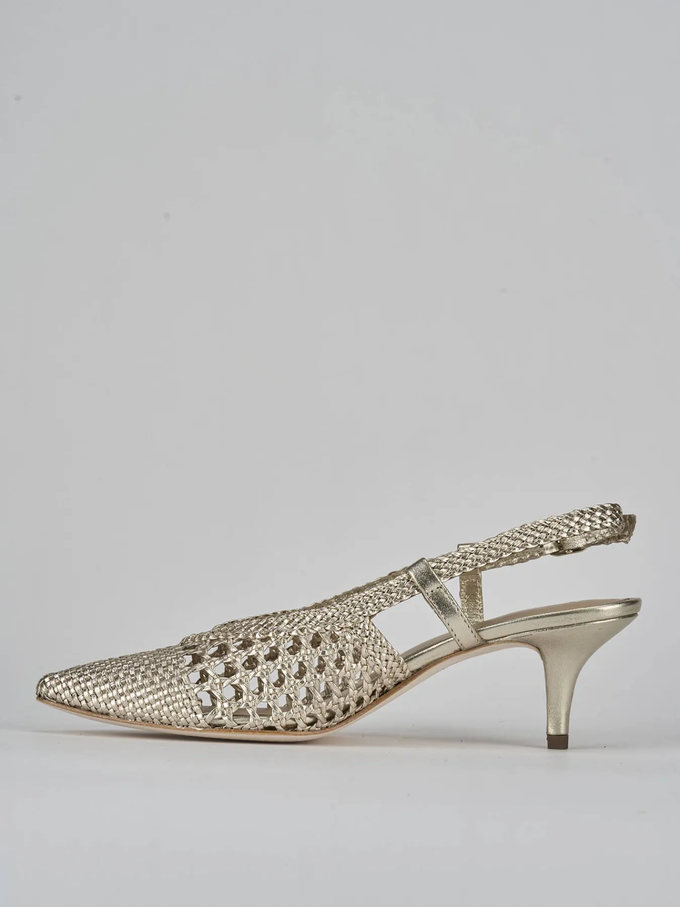 Slingback tacco 5.5 cm fondo in cuoio e soletto interno in vera pelle. Tomaia in morbida pelle finemente intrecciata, punta sfilata, scollo a ‘V’, cinturino con fibbia regolabile e tacco fino per un tocco glamour ai tuoi look.