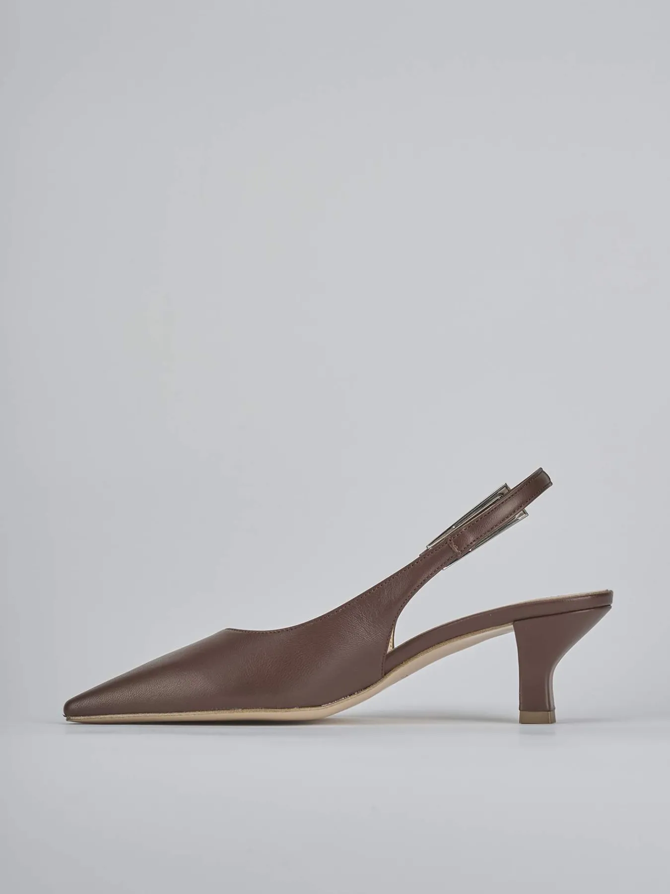 Slingback decolte’ tacco 5.5 cm fondo in cuoio e soletto interno in vera pelle. Tomaia in morbida pelle nappata, punta sfilata, scollo squadrato, cuciture a mano, cinturino con fibbia regolabile e nuovissimo tacco per un look di classe.