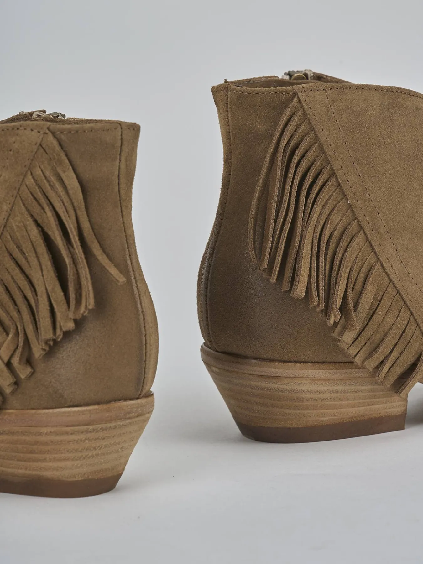 Stivaletto tacco 3.5 cm fondo in cuoio e soletto interno in vera pelle. Tomaia in morbido camoscio, punta sfilata, frange laterali, taglio del gambale leggermente obliquo e tacco stabile. Perfetto sia con un paio di jeans che con una gonna lunga.