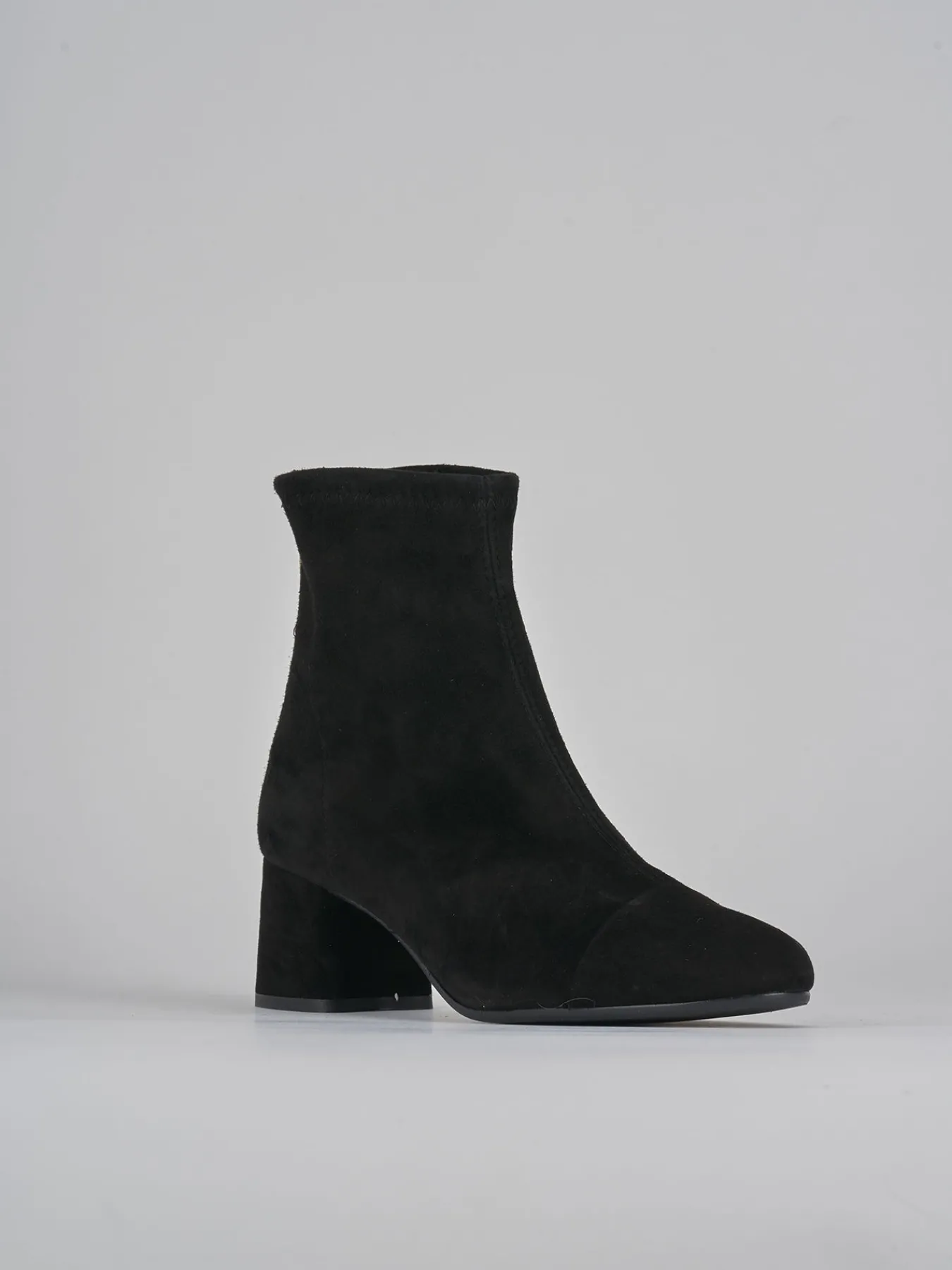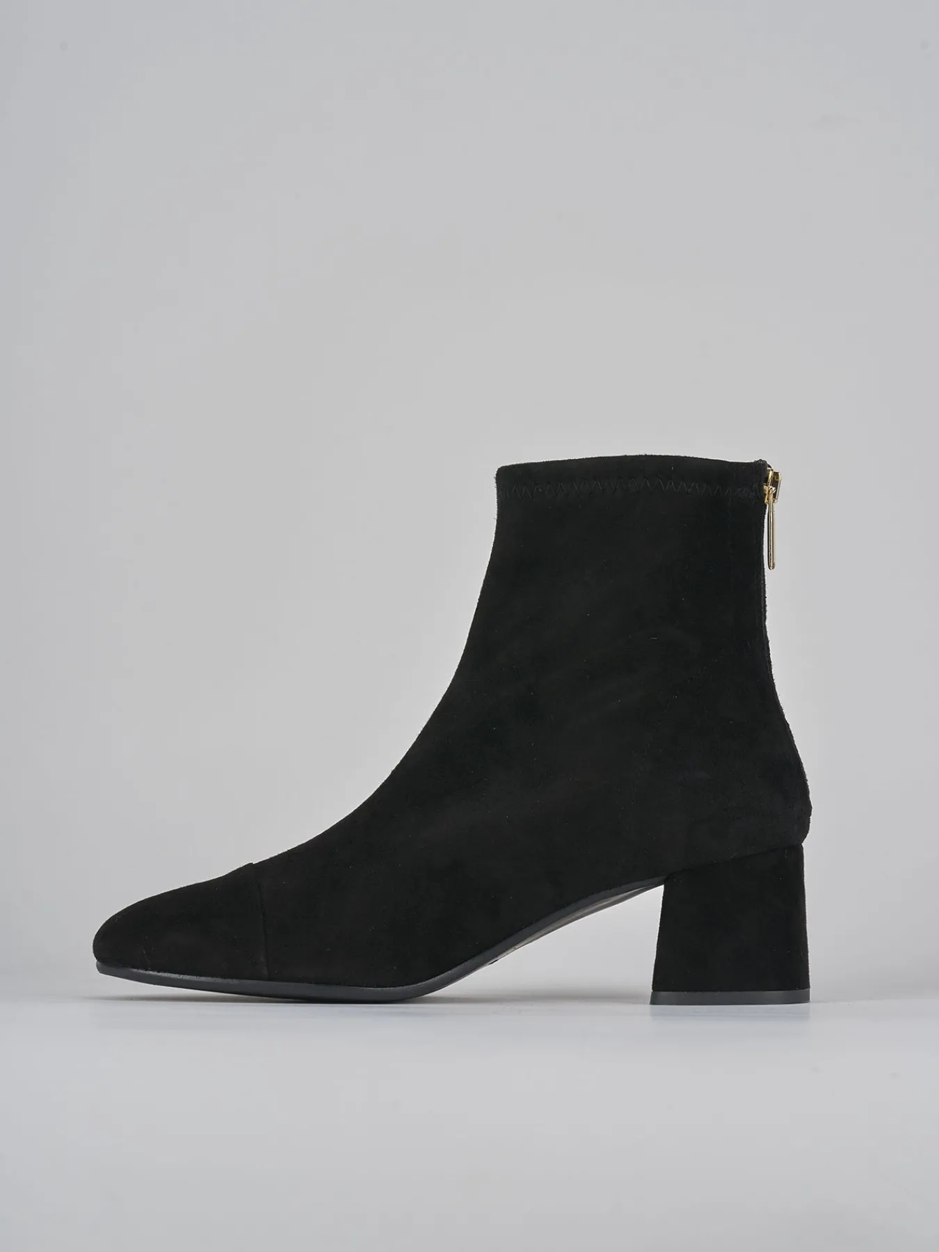 Stivaletto tacco 5.5 cm fondo in gomma e soletto interno in vera pelle. tomaia in morbido camoscio ed elasticizzato solo in caviglia, puntale ton sur ton, comoda cerniera posteriore e tacco grosso per un look che non passa mai di moda.