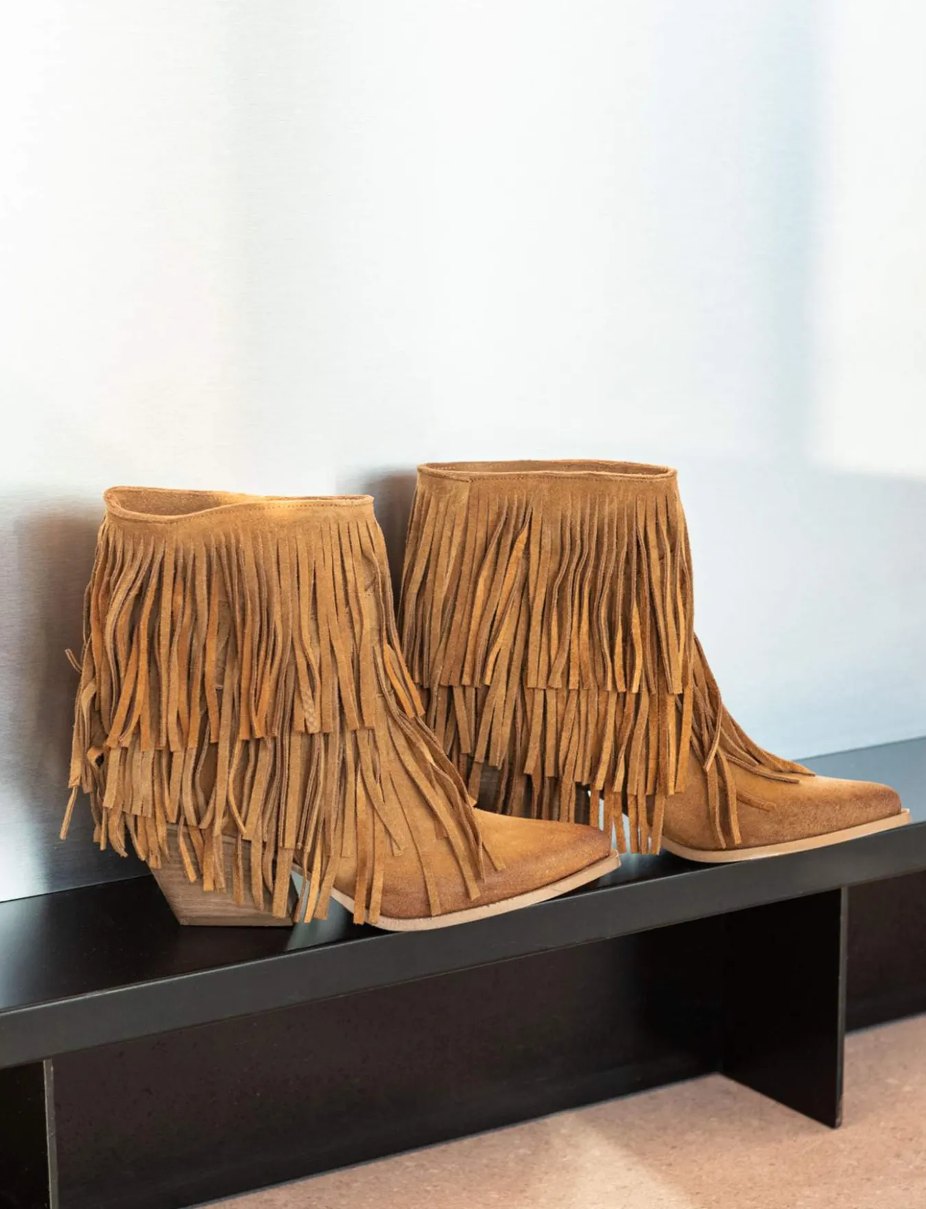 Stivaletto texano tacco 7 cm fondo in leggera gomma e soletto interno in vera pelle. Tomaia in morbido camoscio, punta sfilata, cuciture a mano, frange su entrambi i lati e tacco cubano. Guardolo leggermente sporgente. Perfetto per tutte le tue occasioni.