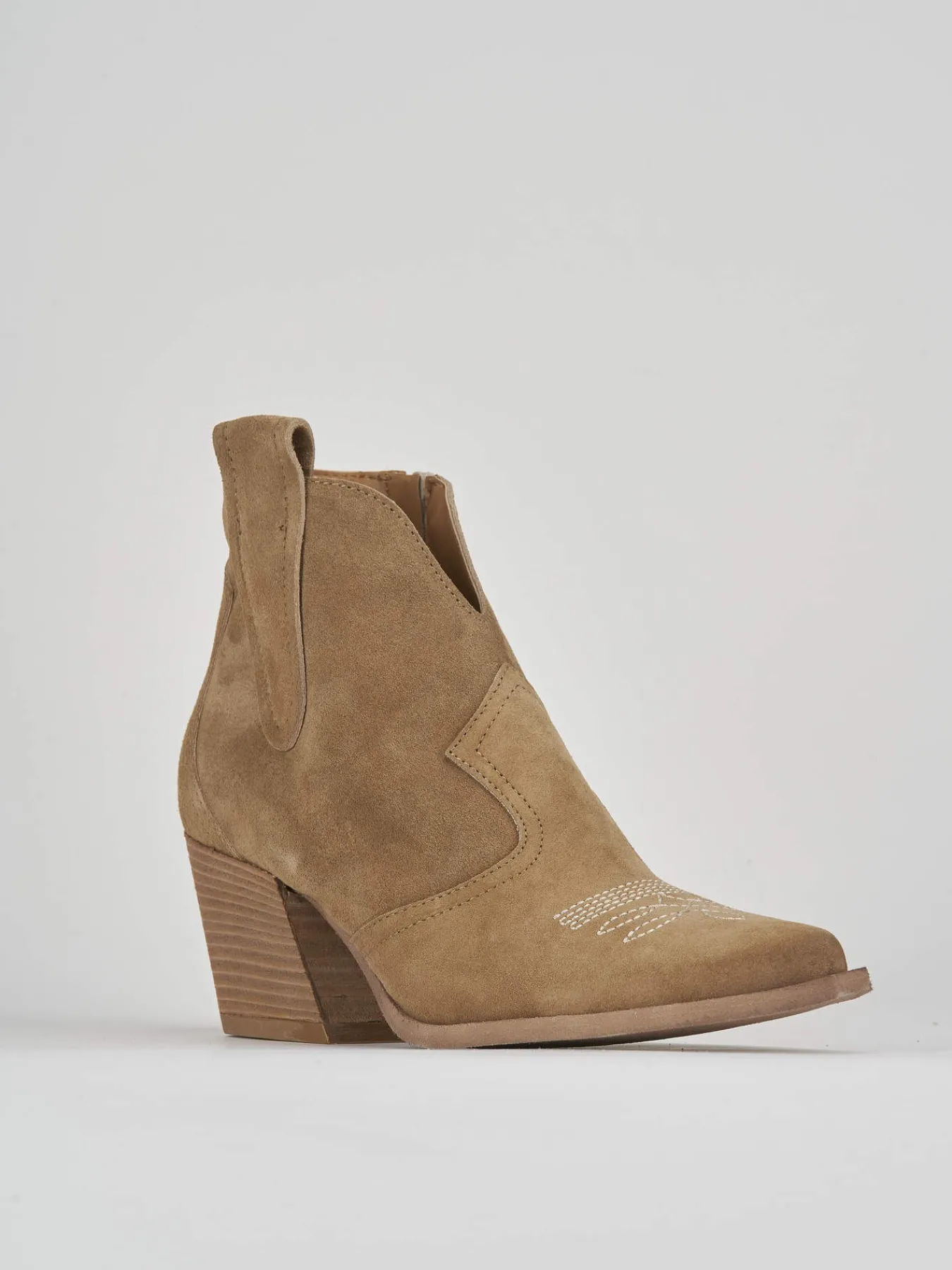 Stivaletto texano tacco 7cm fondo in leggera gomma e soletto interno in vera pelle. Tomaia in pelle scamosciata con ricami a contrasto. Ghette laterali e nuovo tacco per i tuoi tex look piu’ cool!