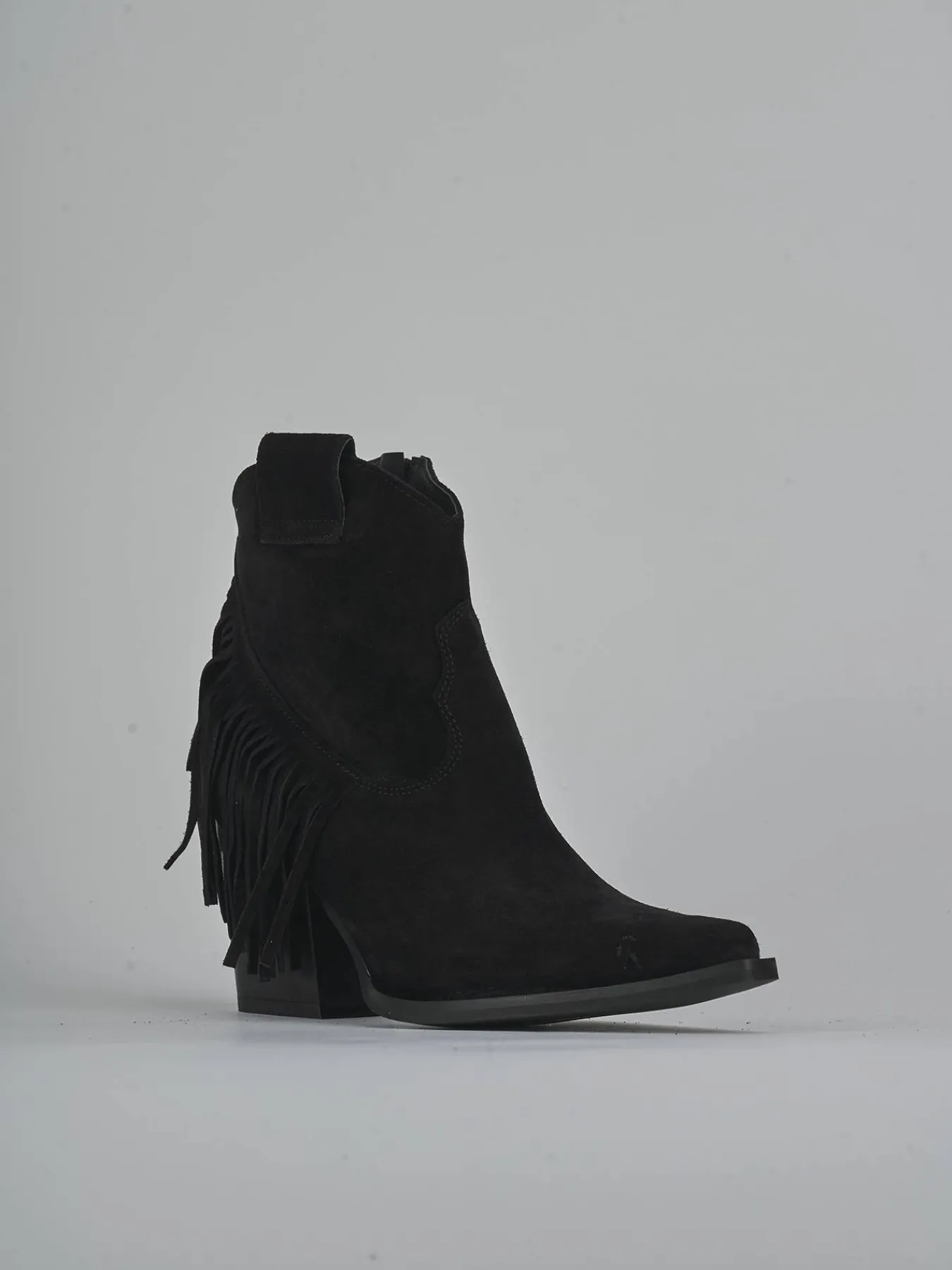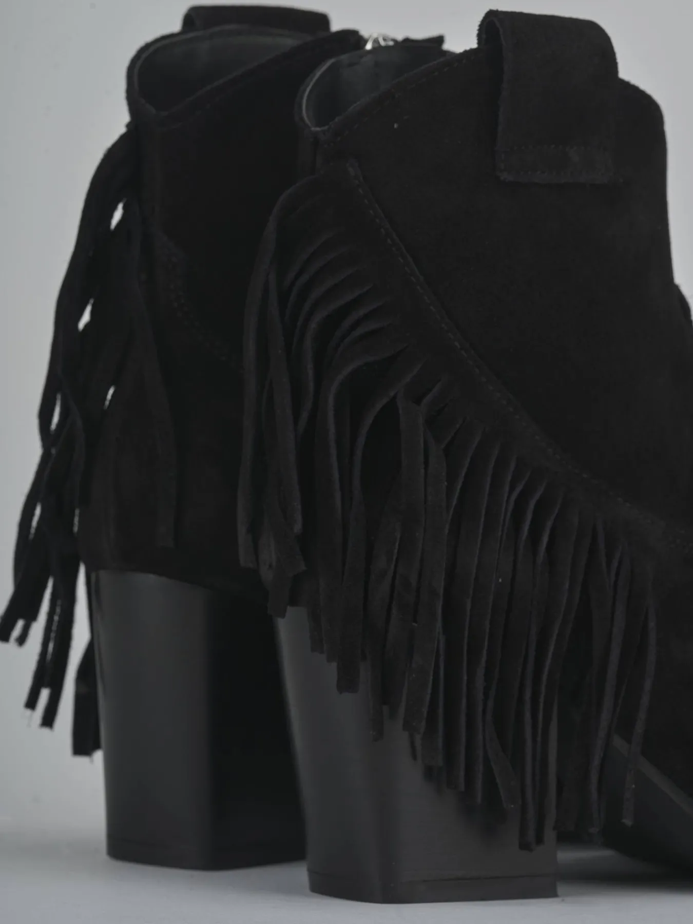 Le frange laterali e le ghette donano un tocco di originalità, mentre l’altezza del gambale sopra la caviglia con scollo a ‘V’ frontale offre un look trendy e sofisticato.