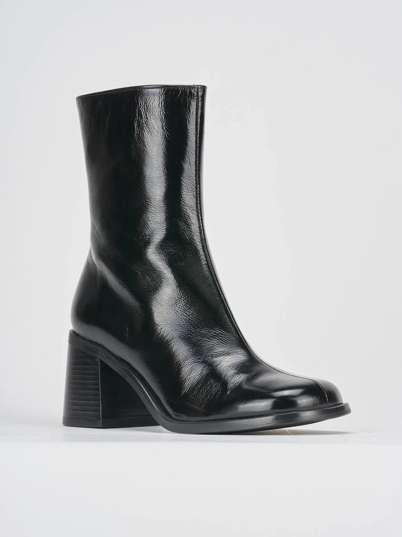 tronchetto tacco 8 cm fondo in leggerissima gomma e soletto interno in vera pelle. tomaia in morbida pelle effetto verniciato, punta squadrata, cuciture a vista, pratica cerniera laterale e tacco in legno per un look cool.