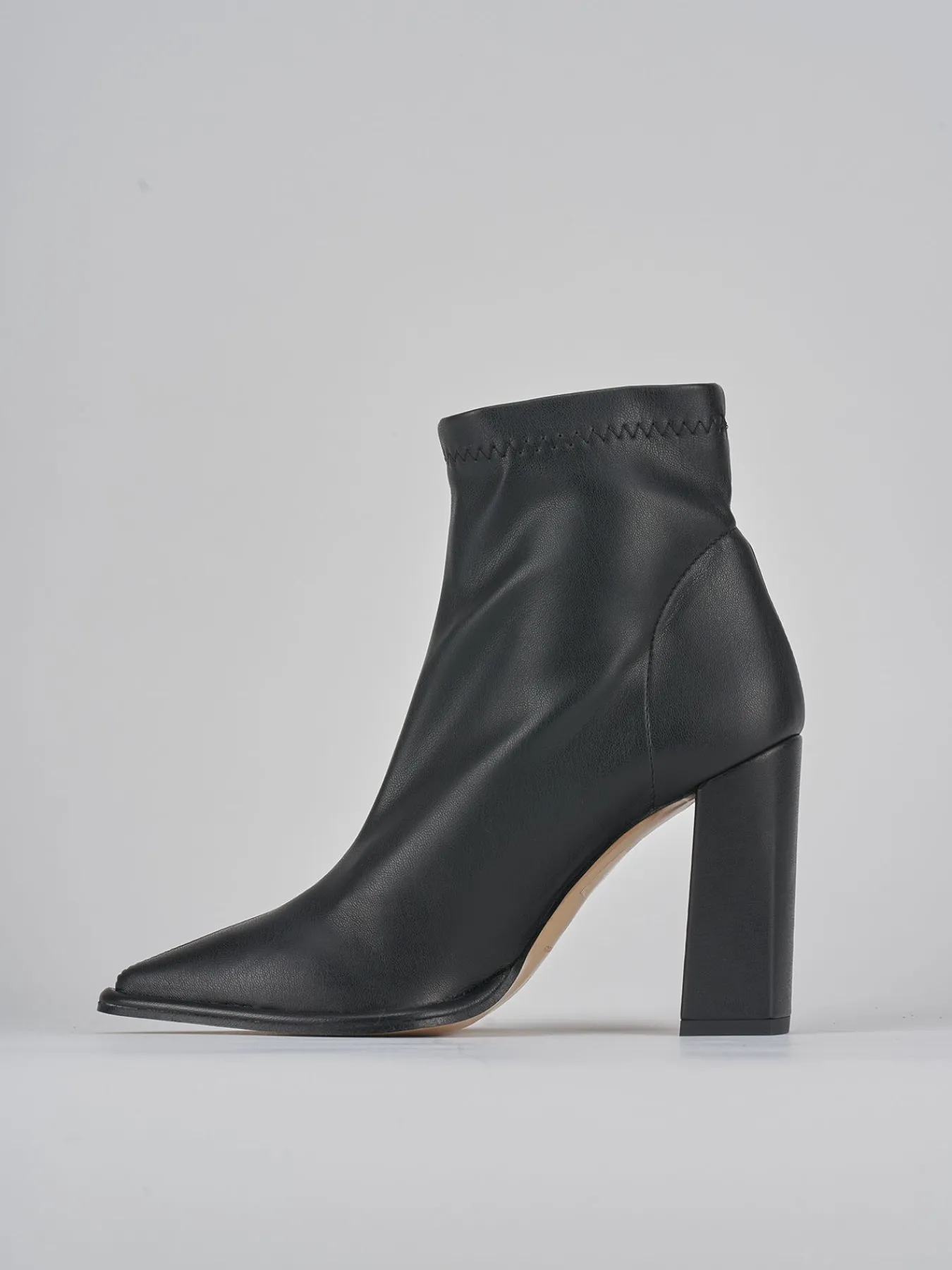 Stivaletto tacco 9 cm fondo in leggera gomma e soletto interno in vera pelle. tomaia in morbida pelle stretch, punta sfilata, cuciture a vista, gambale aderente sfoderato che misura metà polpaccio. guardolo sporgente e tacco grosso per un look cool.